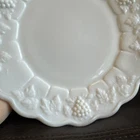 This beautiful Westmoreland milk glass plate is a vintage piece from the mid-20th century. The 6 1/4 inch round plate features an embossed and scalloped edge design with a decorative paneled grape pattern. The white plate is perfect for any occasion, whether it's a love and romance dinner, a bridal shower, or a holiday gathering. The plate is an original and authentic piece, made in the United States with a pressed glass production style. It's recommended to hand wash only for care instructions. The plate is a great addition to any eclectic style decor and is perfect for serving bread, butter, dessert, or any other dish. Get this unique piece now and add a touch of old-world charm to your home.