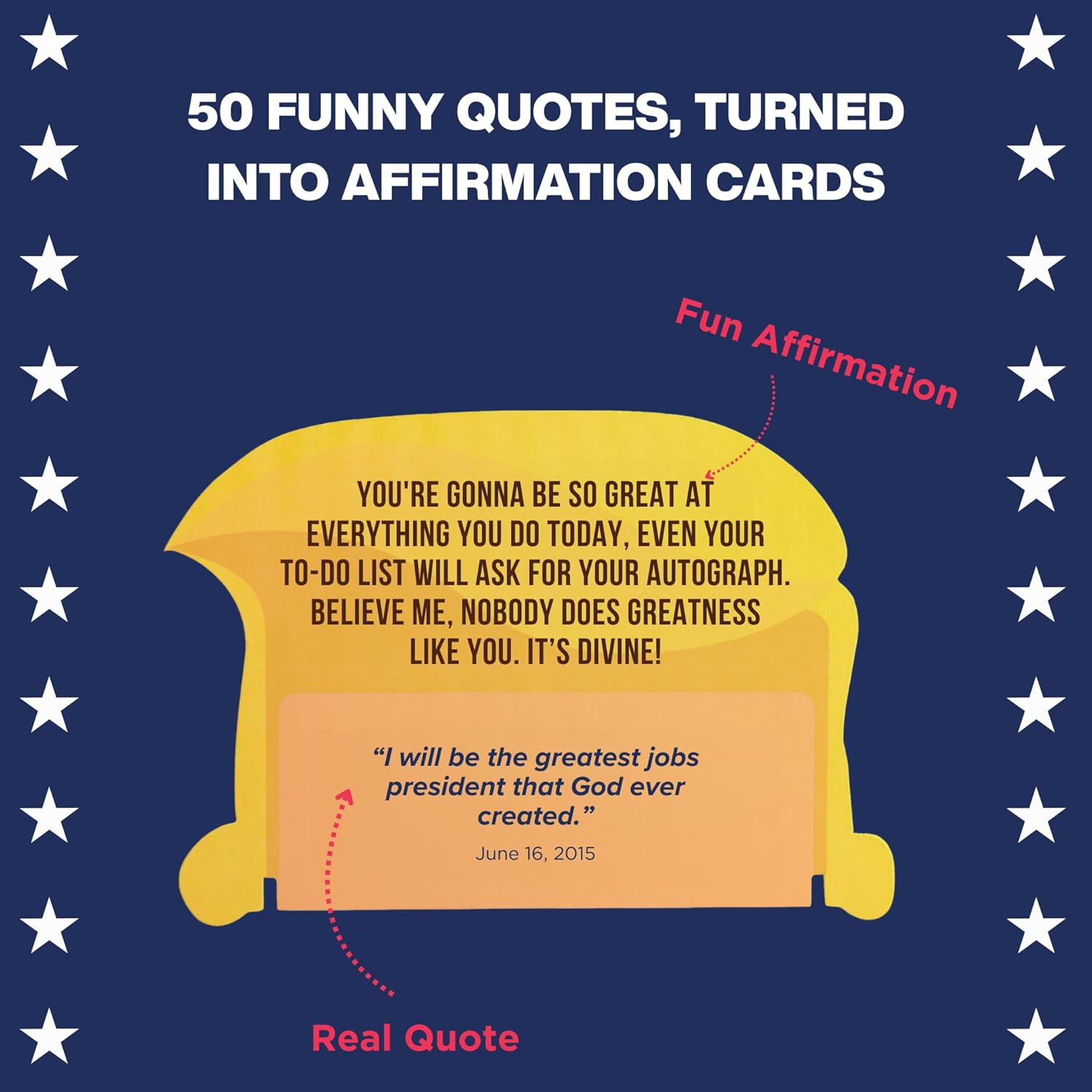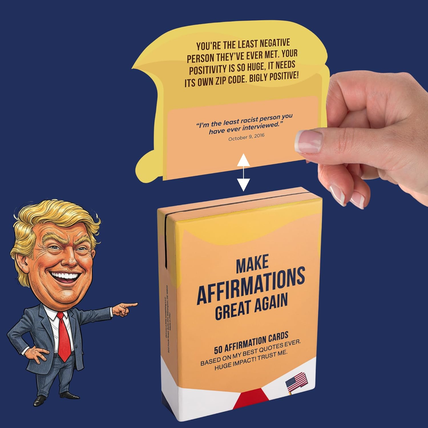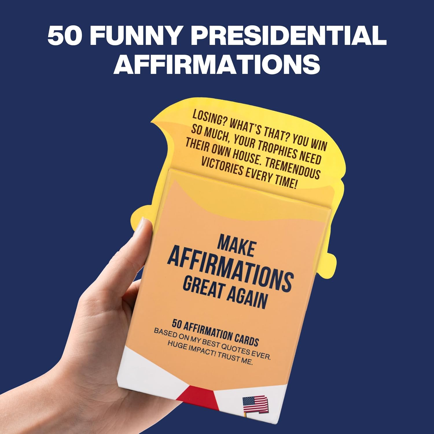 Store New Arrivals Add to Favorite View Feedback Contact Fast deliveries to the customer's home Quality customer service John Make the customers happy! 50 Funny Affirmation Cards by the President | Funny Donald Trump Birthday Gift for Adults, Men, Women, Friends & Coworkers for Birthday, White Elephant, Christmas | Trump Birthday Cards for Women Description FUNNY AFFIRMATION CARDS INSPIRED BY TH PRESIDENT'S MOST ICONIC QUOTES - Bring a smile to the face of your loved ones with these funny affirmation cards featuring 50 affirmations inspired by The DT's most memorable quotes. Each card is uniquely die-cut into the iconic hair silhouette, making it instantly recognizable. Perfect for anyone who appreciates humor and wit, these cards make a thoughtful and entertaining gift for friends, family, or coworkers who enjoy a good laugh. 50 FUNNY HAIR SHAPED CARDS - This set of funny affirmation cards is die-cut into the unmistakable hair silhouette and printed with vibrant, high-gloss inks that pop off the card GIFT-READY CARDS DECK WITH DISPLAY STAND - The packaging includes a built-in window so you can slide in and showcase any card on the front. This clever feature turns the box into a rotating mini-billboard, keeping desks, dorms, and workspaces fun, fresh, and full of personality. FUNNY TRUMP GIFT FOR BIRTHDAYS, HOLIDAYS, AND MORE - Whether you’re searching for a unique birthday surprise, a Father’s Day gift, or a Christmas present, these affirmation cards are a great choice. With their supporter-friendly theme and gift-ready packaging, they make an ideal present for dads, husbands, friends, or coworkers who enjoy humor and positivity. WHAT'S INSIDE - This set includes 50 affirmation cards, each uniquely die-cut into that iconic hair silhouette, all packaged in gift-ready packaging - with high-quality print and interchangeable cards, it's a gag gift that keeps on giving - perfect for spreading laughter and positivity, these funny cards make a great addition to any collection, ensuring that every day is filled with humor and appreciation Product description 50 Funny Affirmations Cards to Make Every Day Great Again Feeling down? These 50 affirmation cards are here to lift your spirits and make you smile. Inspired by some of his most iconic quotes, each card features a hilarious and empowering affirmation that brings bigly positivity to your day. Perfect for anyone who loves humor with a touch of motivation. Display them, gift them, or keep them handy for instant uplift. These are the best affirmations ever, believe me. Tremendous laughter and motivation await! The video showcases the product in use. The video guides you through product setup. The video compares multiple products. The video shows the product being unpacked. Product overview - Make affirmations great again Merchant Video Item model number Funny Affirmation Cards Number of Items 50 Color Yellow Material Type Cardstock Manufacturer Part Number Funny Affirmation Cards Item Weight 7.4 ounces Pre-printed Make Affirmations Great Again - 50 Affrimation Cards Product Dimensions 5 x 3.6 x 1 inches Size Small ABOUT US We offer the best prices around on high quality products. Our E-store includes media such as books, movies, music and games while offering electronics, toys, sporting apparel, clothing, tools, general home, garden items and more. SHIPPING We are always working hard to ensure your package arrives as soon as possible. Please understand that some factors like weather, high postal traffic, and the performance of shipping companies are outside of our control. We offer free shipping to the lower 48 states and ship within 2 business days of payment, usually sooner. We do not accept P.O. Boxes. Please provide a physical address. For shipping outside of the continental USA, we only use eBay's Global Shipping Program. The item is shipped to KY and then sent to the rest of the world. International customers are responsible for all duties and taxes. Continue to 'check out' to calculate costs for shipping the item to your country. Messages regarding eBay's Global Shipping Program MUST be directed at eBay EXCLUSIVELY. RETURNS We offer a 30-Day Return Policy on items in which you are not completely satisfied with. You have the option of a full-refund or an exchange of the item. No returns are available on items shipped outside of the USA PAYMENT We accept PayPal. CONTACT US This page content is yet to come Please ad us to your favorite seller and visit again later Thank You CUSTOMER SATISFACTION We try our very best to make sure every customer is completely satisfied. If there's a problem, message us! We're happy to help. WE ACCEPT