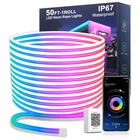 RGB Neon Rope Lights 【Enter the Neon World】 Neon lights strips offer a richer color palette than regular LED strip lights. Decorate your bedroom, gaming room, or accent wall with neon rope light, and turning them on feels like stepping into a cyberpunk world. Neon LED rope lights have different modes to suit a variety of occasions (Note: neon rope lights can only present one color at a time) 【Shape It to Your Desire】 Flexible neon led lights for bedroom can be easily bent into different shapes. You can simply install them around the contours of objects or unleash your imagination to bend them into shapes like hearts, guitars, game controllers, and more to match any style you desire. (Tip: secure them with the included screws and clips) 【Two Ways to Control】 Neon rope lights indoor can be controlled via an app or the included remote. The app allows for fine-tuned personalization with 16 million color combinations, preset scene modes, music mode, and timer functions. The app "illumihome" is available on Google Play and the iOS App Store 【Outdoor Use Supported】 Neon RGB lights for room aren't just for indoor ambiance enhancement; they can also be used for outdoor decoration. The neon strip lights are IP67 waterproof, so you don't have to worry about water damage. Note: The power supply and controller (the white box with a QR code) are not waterproof 【Durable and Energy-Efficient】 The neon leds for bedroom undergo durability testing before shipment, ensuring brightness and lifespan. A 32.8ft neon light strip contains 300 LED beads, providing ample brightness for various occasions. It also comes with a 24V power supply, which consumes less energy and generates less heat than traditional neon lights. (Package contents: 50ft neon light strip *1, control box *1, power adapter *1,screw and fixture set *1) 【Note】Neon rope lights are mainly used as atmosphere lights in the bedroom, and they are used for different shapes and decorations. The brightness is not enough for lighting