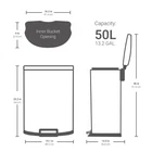 Well Designed and Engineered 50L Stainless Steel Step-On Trashcan Suitable for any area of your home, this well-designed and engineered 50L Stainless Steel Step-On Trashcan is versatile and fits seamlessly in various spaces. The D Shape design allows it to blend in perfectly in areas such as kitchens, offices, living rooms, restaurant bathrooms, bedrooms, dorm rooms, or any open space . The removable bucket liner feature allows you to keep the bag from public view, maintaining a neat and clean appearance. 50L capacity with easy step-on mechanism Stainless steel construction with soft close lid closer Removable bucket liner keeps the bag from sight Keeps trash orderly for a tidy space Versatile slim design suitable for many areas Make trash disposal easy and stylish with this Stainless Steel Step-On Trashcan. The removable bucket liner ensures that the bag remains , contributing to a neat and organized space. The easy step-on mechanism and soft close lid closer add convenience to your waste management. OUR QUALITY: High-Quality 430 Stainless Steel and ABS Construted. Our Trashcan is Build to Last! Fingerprint and Smudge Resistant Coating Make Cleaning a Breeze. OUR CFRAFTSMANSHIP: Large, Wide Opening Area. Provides Easy Access for Daily Chore Work. OUR DESIGN: Modern, Stylish, Elegant, Completes and Show Case Your Home With This Missing Piece OUR VISION: Multi-Purpose, Suitable for Kitchen, Bath, School, Hotel, Airport, Construction Site, Office Space, Indoor/Outdoor, Boat, RV, and More.. OUR PROMISE: 100% Satisfaction Backed by Dedicated Customer Support Team, Worry Free Defective at No Additional Charges to You.