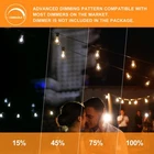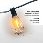 Features Outdoor String Lights create a warm soft ambiance to transform your space A perfect LED Edison string light for bistros, cafes, backyards, Partys, Weddings, etc. occasion Patio lights outdoor Waterproof can be used all year round, windy, rainy and snowy days Specifications Wire Length: 50 feet Socket Type: E12 Socket Quantity: 28PCS Bulbs Quantity: 25+3PCS Bulbs Type: ST38 Watt of bulb: 0.5W per LED bulb Lumen: 60Lm per bulb Volt: AC120V Plug in Color Temperature: 2200K warm white Connectable: Link to Max 30 strands Dimmable: Yes(Dimmer NOT included) Package Included 1 x 50FT 25 Sockets Cable 1 x 25 Clear Plastic Bulbs + 3 Spare Bulb 1 x Spare Fuse 1 x User Manual Warm Tips 1.These light strands are connected in parallel, so one bulb goes out will not affect others Lighting. 2.Each set comes with a spare fuse in the male plug, you could replace the fuse when all the strands are not working. 3.If you have any problems, please don't hesitae to CONTACT us (the seller) in time. 【Waterproof Edison Outdoor String Lights】Edison string lights outdoor set with lightweight wire, IP44 waterproof rating, confidently leave lights on display year round. Edison soft warm string lights create a vintage effect, antique ambiance and romantic atmosphere. Great ideal use for yard, deck, gazebo, pergola, fence, cafe, restaurant, canopy, umbrella, Bistro lights, or anywhere you need ambient. 【Energy-Saving and Dimmable Long String Lights】: 50FT String Lights come with 25+3pcs high efficiency 0.5W ST38 edison vintage style LED filament bulbs, which can dramatically reduce electricity bills compared with incandescent bulbs. LED outdoor string lights are compatible with most dimmer at the market.(Tips:Dimmer not included) 【Shatterproof ST38 Bistro Lights Outdoor】ST38 Edison bulbs are made of clean Plastic, shatterproof outdoor string lights are safety when touch even if drop down or blow away by the wind, bistro lights outdoor will not easily break if dropped, more safer and durable than traditional glass bulbs. Edison outdoor string lights have a longer lifespan 15,000 hours. 【Easy Installation and Connectable Patio Lights】: outdoor string Lights 50ft with 5.74ft leading wire, 25pcs E12 Sockets and spaced 1.8ft apar. Patio lights can be connected up to Max 30 strands via end to end plugs, they could lights yours whole patio space. Each socket includes a hanging hook design allows for hang up and installation anywhere. Widely use for wedding, party, Christmas and many other occasions or events. 【Customer Satisfaction with Outdoor String Lights】: Your satisfaction is our first priority, confident 2 years warranty for ST38 Edison string lights. Any your concern will be responsed in 8 hours.