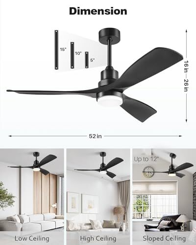 Return Policy Fast Delivery Trusted seller Ceiling Fan with Lights Remote Control, 52 Inch Black Ceiling Fans with 3 Downrods, 3 Blades, Timer, 6 Speed Modern Fan Quiet Reversible DC Motor for Patio Bedroom Outdoor/Indoor Product Description 【52" Ceiling Fan With Light】With its elegant black finish and 3 ABS blades, this black ceiling fan is perfect for covered outdoor, patios, farmhouses, gazebos, living rooms, bedrooms, offices, and boutiques. Black fans enhances style in homes, commercial, and industrial spaces. 【Easy Installation】Our 3 blade black ceiling fan with light comes with instructions and a simple wire connection for indoor/outdoor/tilted (up to12°) installation, with 3 downrods (5"/10"/15") for any size room, and its hassle-free design saves you time and effort. 【Efficient & Quiet】Enjoy peace and quiet with our modern ceiling fan. It quietly moves a large amount of air at 25dB, even at 160r/min speed. The black fan boasts a reversible pure copper DC motor, providing precise control and 75% energy savings. High CFM Performance, Achieve superior airflow with a maximum CFM of 6500, enjoy unparalleled airflow. 【Remote Control】Our 52 inch black ceiling fans with 3 light color temps (3000/4500/6000K), 3 timers (1/2/4h), 6 speeds, and reversible airflow. Control lighting & ceiling fans separately with remote. Note: 2 AAA batteries required (not included). 【After-sale Service】's ceiling fan is ETL and FCC certified. We offer a reassuring 3-year warranty for balck ceiling fan with light. Motor warranty. Our customer support is always available for any installation or usage issues. Shipping Returns Payment Shipping Shipping is FREE to all addresses other than APO/PO boxes in the lower 48 states. All our stock ships from US-based warehouses. Shipped via USPS or UPS (depending on location and package weight) Unless stated otherwise, all orders will ship within 24-72 hours of your payment being processed. Check our feedback to see the great reviews of FAST shipping we offer. Returns Seller does not accept returns Payment We currently accept payment via eBay managed payments only. Once payment is cleared, we will dispatch your shipment within 1-3 business days. Please refer to the "Shipping" tab for more information regarding shipping speed to your destination.