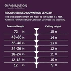 The 52 inch Fanimation Studio Collection AireFlex ceiling fan features a black finish and 3 blades to bring exciting sophistication to your home. This versatile fan has 16 speed settings, so you can maintain the ideal comfort level with ease. Mounts to flat or sloped ceilings with 4.5-in downrod included. An integrated 18W LED light with frosted glass brings overhead illumination, while featuring a Correlated Color Temperature (CCT) Select Technology which allows you to choose the CCT of your fans light kit - 3,000, 4,000 or 5,000K. Reverse airflow feature allows you to change the fan's direction setting seasonally, so cool air is pushed down or warm air is distributed evenly. 16-Speed, Reversible DC Motor provides airflow up to 5,910 CFM. Compatible with most smart home devices (required control sold separately) Black finish ceiling fan from the AireFlex Collection features 2 blades in a Black finish with an 18-watt LED light kit with frosted glass shade. TR305S hand-held remote control is included. Push button remote control with 16 fan speeds, fresh air, reverse, ON/OFF dimmer light levels, color temperature, fan/light timer, home away, safe exit and off button Fan comes with an 1" diameter x 4.5" length threaded downrod. Optional downrods are available in lengths up to 72 inches. For installations requiring a longer downrod, a downrod coupler is available. Fan can be mounted on a sloped ceiling up to 19°. Optional close-to-ceiling kit is available as well - sold separately. Optional sloped ceiling kits (SCK1-52) are available for up to 42°. Damp Rated for indoor and outdoor use