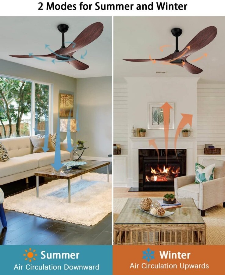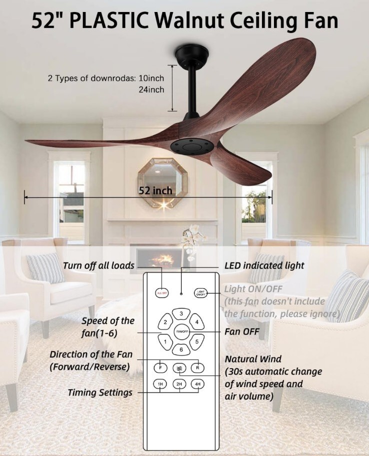 Box was opened to find color. Item is new Top Highlights Brand- KASASS Color- Walnut Color Material- Metal,ABS Plastic Style- Modern Fixture form- Ceiling Room Type- Kitchen, Bedroom, Living Room, Home Office, Dining Room Product Dimensions- 52"L x 52"W x 16"H Indoor/Outdoor Usage- Outdoor, Indoor Power Source- DC Special Feature- Remote Controlled, Reversible, Timer Control Method- Remote Blade Material- Plastic ❄️【Modern Ceiling Fan】52" Ceiling fan indoor/outdoor features 3 pcs lacquered walnut veneer plastic fan blades and 2 down rods (10"/24"). Ceiling fans are made of very strong and durable plastic material that is moisture-proof and will work well in wet outdoors. It is the ideal fan for living rooms, bedrooms and farmhouses. (Please note: the fan blades are made of plastic!) 😊【Whisper Quiet Reversible DC Motor】KASASS ceiling fan without light can be switched in summer or winter to create a cooling effect or to help move warm air. Ceiling fans that can be used throughout the year not only add comfort to your home, but also achieve decorative effects. Compared with AC motors, DC motors are quieter, the noise level is lower than 35dB, and they are more energy-efficient and environmentally friendly. ❄️【6 Speed Wind Adjustment and 3 Timer Settings】Outdoor patio ceiling fan with remote control, you can press (1/2/3/4/5/6) button to control 6-speed wind speed, then press (1H/2H/4H) ) button to set the timer. Slow wind is suitable for sleeping, working and reading, medium speed is suitable for family gatherings, and high speed is suitable for sports. You can adjust it freely according to your situation. 😊【Easy to Install & Suitable for Flat and Sloped Ceilings】KASASS Indoor Outdoor Ceiling Fans are available in 2 installations Flat and Sloped Ceilings, up to a maximum inclination of 18°. It can be installed on wooden and concrete ceiling