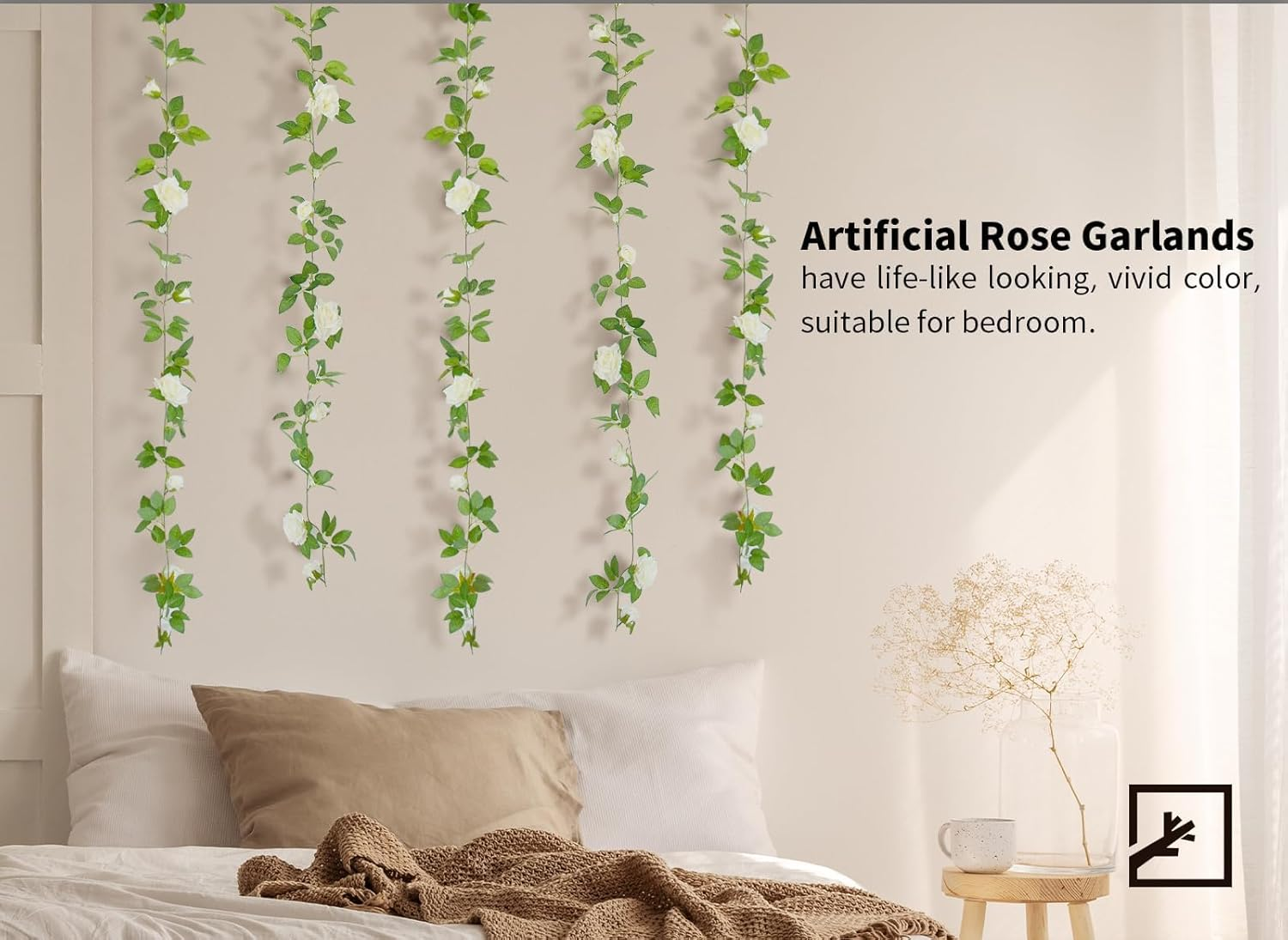 [Package]: The package includes 5pcs artificial white rose vines. Each garland with 4 rose flowers and 4 rose buds. [Size]: The length of the flower garland is about 6.5ft/2m. The diameter of each rose flower is 3.9"/10cm. [Material]: Artificial rose vine are made of high-quality safe plastic and silk. The flowers and leaves are full and lifelike. [Convenient]: Artificial floral garlands do not require much maintenance and care. Each fake flower garland has hooks at both ends for easy hanging. The flowers and leaves can be installed and removed easily. It's easy to shape into what you want. [Usage]: Our products are perfect for wedding decorations, which can decorate wedding arches, chairs, windows. Artificial rose garlands have life-like looking, vivid color, suitable for balcony, living room, cafe, staircase, office, bedroom, kitchen, outdoor, indoor etc. Product Description ARTIFICIAL FLOWERS Versatile Decoration Combine with other flowers bouquets to make a wedding bouquet Versatile Decoration Use our small pampas grass stems to decorate your party and wedding decor Versatile Decoration Our products can be used to make wreaths, wedding bouquets, wedding decorations Length and Quantity 15 IN & 36 Pcs Length and Quantity 17 IN & 6 Pcs Length and Quantity 11 IN & 30 Pcs