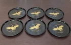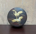 6 Laquer Coasters Sey by Mitsukoshi with Gold Cranes in Flight Designs Made of High-quality plastic that retains a nice sheen and looks like lacquer. Coasters about 4" D. Box is 4.75" x 2"