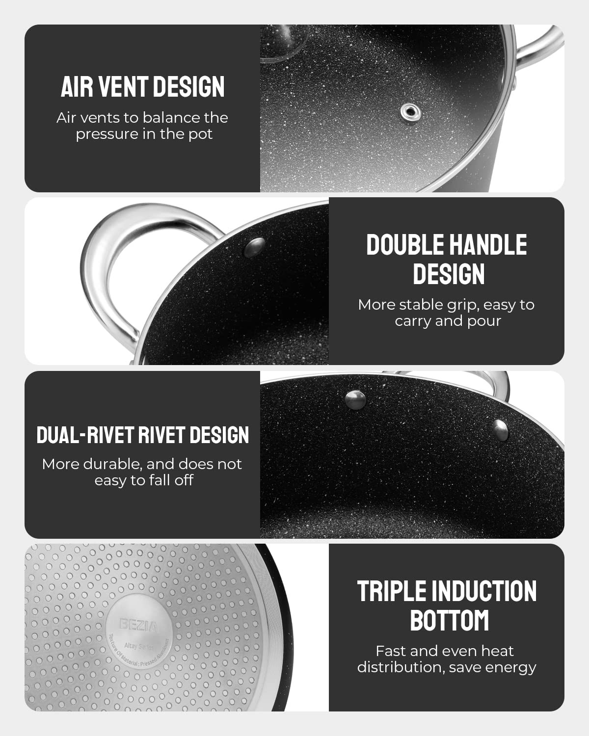 Healthy and Non-Toxic: The 6-quart cooking pot with lid has a healthy granite coating that is free of PFOS, PFOA etc, allowing you to enjoy delicious and nutritious meals with peace of mind. Easy to Clean: The rough granite non-stick coating prevents food and sticky sauces from sticking and burning to the stock pot, making cleaning a breeze. Efficient Heating: The aluminum body structure of this soup pot ensures efficient heat distribution, resulting in fast and even cooking throughout the soup pot, saving you time in the kitchen. Compatible with All Stove Types: Including gas, electric, halogen, ceramic, and induction cookers, this induction pot provides flexibility for any kitchen setting. Oven Safe: The 6 quart pot is oven safe up to 450°F, but the lid should not be placed in the oven. When using the big pot at high temperatures, be sure to wear oven gloves to avoid burns. Shatterproof Glass Lid: The perforated design allows excess water vapor to escape, retaining the original flavor of the food and allowing you to monitor the cooking status at any time. Multiple Cooking Methods: The non-stick pot with lid is an essential piece of cookware in the kitchen, enabling you to easily cook a variety of dishes, including curry, pasta, vegetables etc. at home.