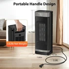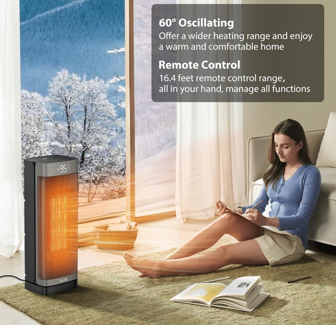 Powerful and Faster Heat: Space heater with 1500W Fast PTC Ceramic Heating, it heats up the room in no time, can quickly heat an area of 270 square feet. The heater has a remote, which makes it easy to operate, especially when you want to switch it off or adjust the temperature without leaving your comfort zone Multiple Safety Protection Mechanism: Indoor heater with ETL-Certified Safety, it made with V-0 flame retardant materials and provides tip-over and overheat protection, safety plug, to ensures that the heater is safe to use at all times, is the perfect choice for families with children and pets Energy Saving ECO Mode: Space heaters for indoor use, with multiple modes (High/Low/ECO/Fan Only), When you select ECO mode, you can press "+" or "-" to adjust the temperature to generate more or less heat. The temperature setting range is from 41 to 95℉, adjustable in 1℉ increments Can Be Used Anywhere: Electric heater comes with 60 °Oscillating feature,which ensures that it distributes heat evenly in the room, suitable for use in bedrooms, garages, basements, offices, etc. The hidden rear carrying handle ensures easy transport and storage whenever needed Noiseless Experience:Portable heater features a silent fan design, he working noise is 38db,it does not affect your work or sleep. the heater has a Timer, which you can set for up to 12 hours, which ensures that the heater switches off automatically, saving energy and preventing overheating