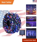 600 LED 4th of July Decorations Solar Lights, Red White and Blue Lights Outdoor Waterproof, 8 Modes Patriotic Solar String Lights for Independence Day Tree Camper Party Patio Decor SUPER LONG RED WHITE AND BLUE SOLAR LIGHTS - The solar string lights include one reel, a total of 600 LEDs with one super large battery capacity solar panel. Total Length: ft. Light Length: feet. Lead wire Length: Space between LEDs: inches. 4TH OF JULY SOLAR LIGHTS - Want to make your home more festival on the 4th of July? Then don't miss out on the red white and blue string lights. 600 premium LEDs emit all-around light, soft, and brilliant lights, wrap them in the tree, or bush, just like stars twinkling inside, and hang them on the patio to create a festival atmosphere. To add a charm to your home, make those places look very popular and catch one's eye. Happy 4th of July! 8 MODES & MEMORY FUNCTIONS - These solar string lights have 8 lighting modes(combination, in a wave, sequential, slo glo, chasing/flash, slow fade, twinkle/flash, and steady on). A built-in memory chip saves your last mode setting without having to reset the mode every day. You could press the button till the mode you like, so the lights will stay on the specified mode. WIDELY USED SOLAR PATRIOTIC LIGHTS - Our outdoor solar lights can charge during a sunny, and 8 hours of automatic work in the dark. Solar panels with ground stakes that you can place in a sunny place. The solar string light is perfect for wrapping in a tree or anywhere you want to decorate. It creates a warm, joyful and festive atmosphere for Independence Day decorative passageways, gardens, terraces, yards, lawns, fences, porches, roofs, Christmas, weddings, holidays, parties, etc. WATERPROOF AND SAFE - The outdoor solar string lights can withstand various weather (IP44), including heavy rain and snow, and are very suitable for indoor and outdoor decoration(Do not soak). No heat(The insulated copper wire keeps the lights at a low temperature so they are safe to touch after many hours of use), no radiation, low consumption, high safety.