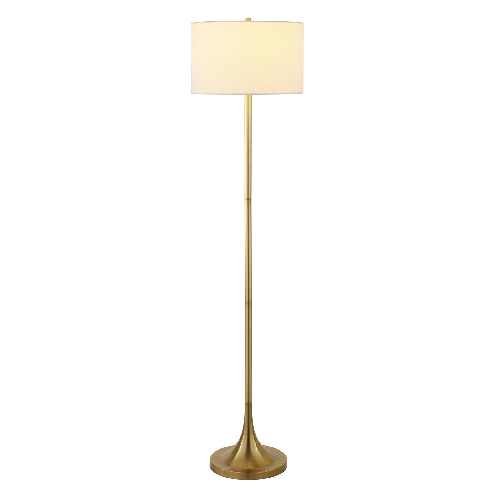 Modern and contemporary design for your living room, office space, bedroom, or reading nook. Handcrafted brass finish is applied to the candlestick metal base. Paired with a white drum linen shade. Includes a 8 ft. cord with rotary socket switch. Smart Technology allows this lamp to integrate with major hubs like Alexa and Google Home.