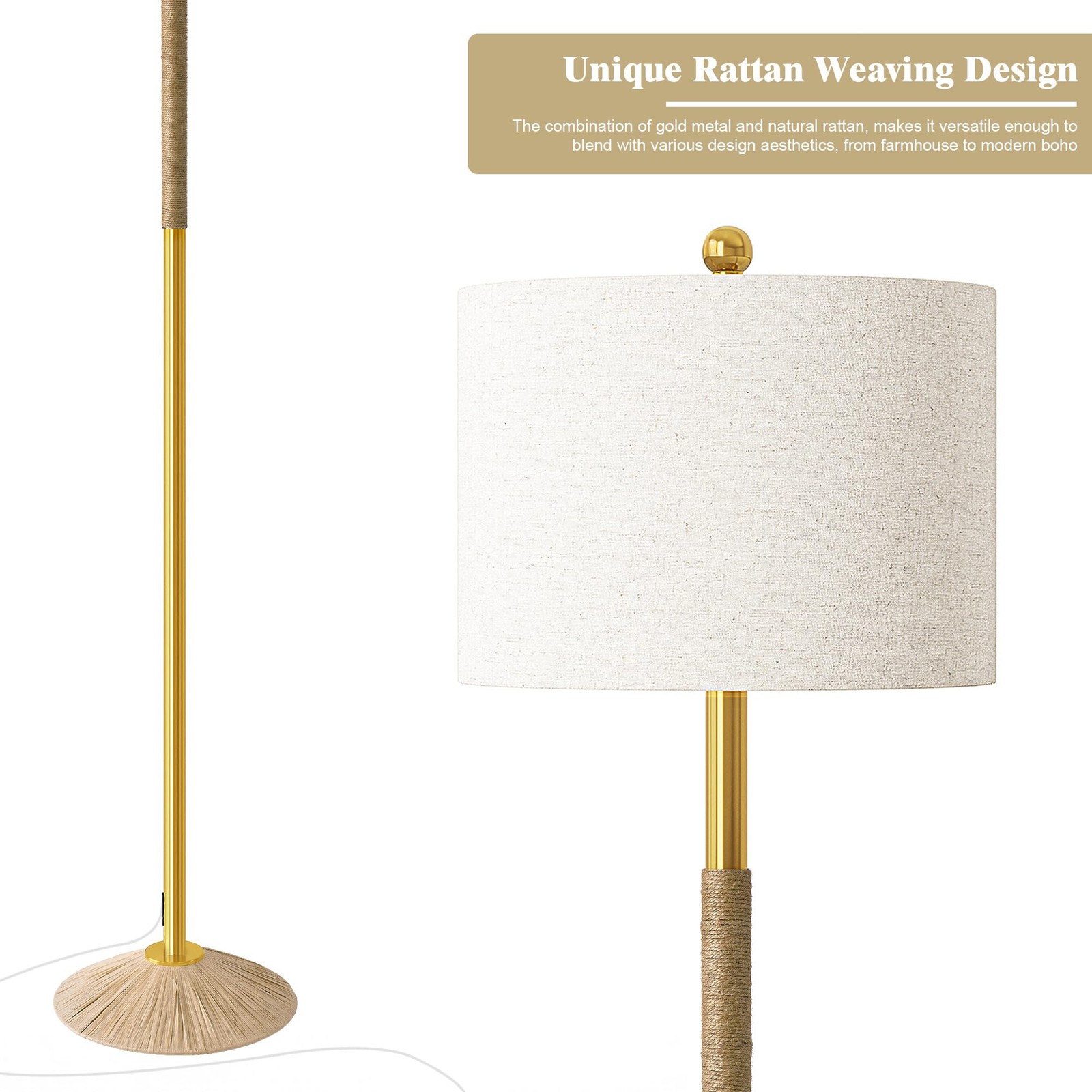 Simple Minimalist Boho Farmhouse Standing Lamp for Bedroom, Office, Gold Pole Lamp(Without Bulb) Unique Elegant Design Floor Lamp: The gold pole and lamp base are wrapped with rope, and with the natural linen shade, creating an elegant bohemian look that can be easily incorporated into most decorating styles such as Modern, Classic, Country, Vintage, Farmhouse, Coastal Nautical, Northern European and more Tall Floor Lamp & Space-Saving: This floor lamp is 63'' tall, this size is ideal for most rooms including living room, bedroom, study, dining room, sofa, and any other room that requires lighting from a height. And We recommend you use a 2700K warm white light to fit this standing light which can create a cozy atmosphere. Note: Bulb not included Sturdy Safe Heavy Base Corner Lamp: Built with sturdy metal material, this standing lamp is sturdy and tip-resistant, not easy to bent and fall down. It has an excellent stability which will prevent falling when it's knocked by kids or pets. 6FT cable allows you to place the tall bedroom lamps in any place you want Easy to Install: This Farmhouse Floor lamp just needs 5-10 minutes to be installed, no additional tools are required. You only need to do a quick lamp shade assembly, and screw the poles one by one from the top to the bottom and pull the cable during screwing, then insert them on the base Customer Satisfaction: We are committed to providing our customers with premium products and services, your satisfaction is our top priority. If you are not satisfied with our lamps, please contact us and we will give you a satisfactory answer within 24 hours