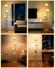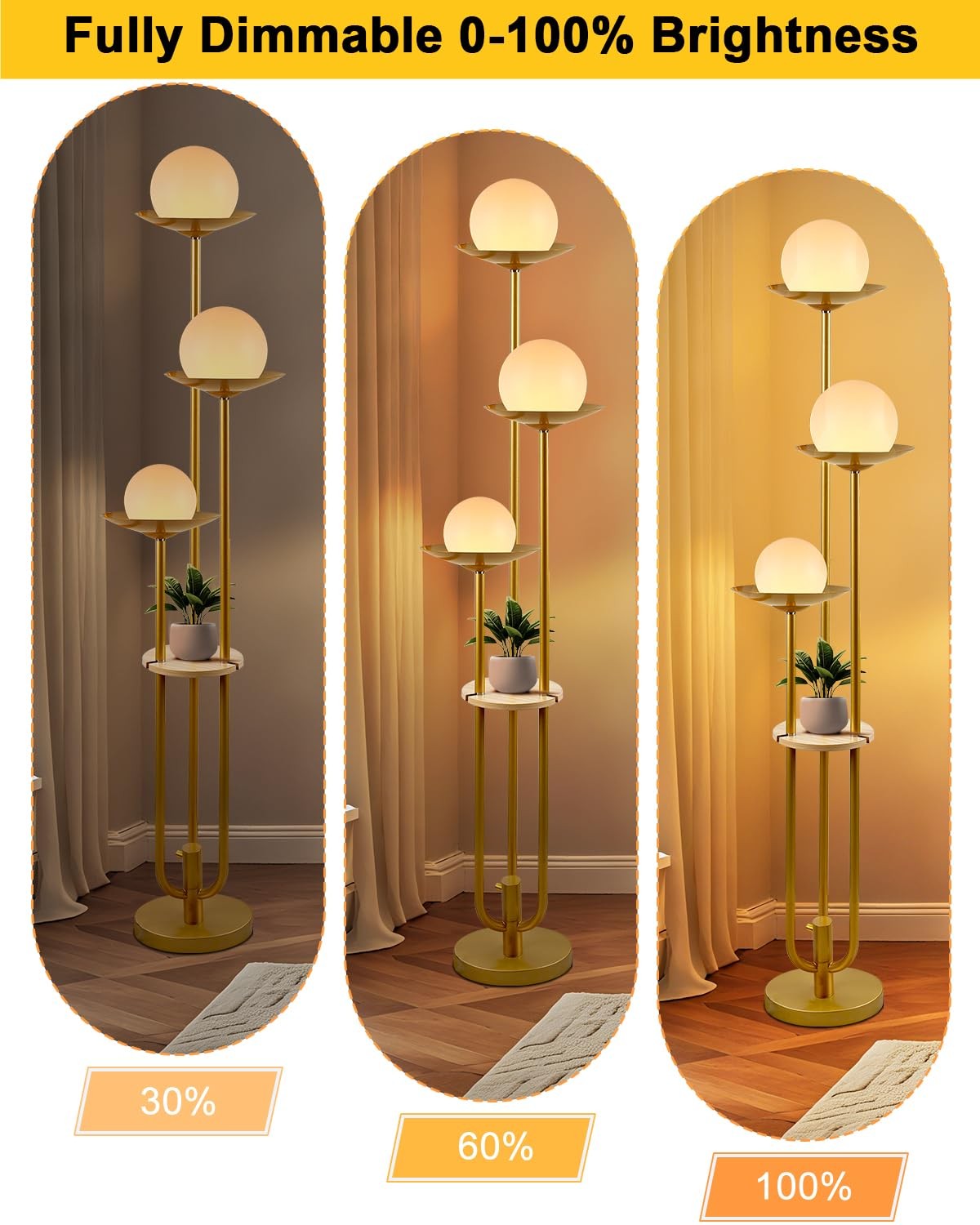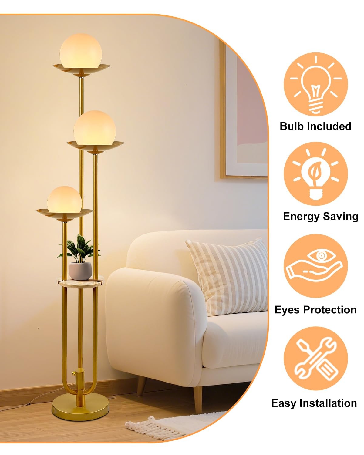 63IN Globe Floor Lamp with Shelf 3-Lights Modern Dimmable Floor Lamps with 3000K Soft Warm White Bulbs for Wedding/Party, Gold Tall Standing Lamp for Living Room/Bedroom Unique & Exquisite Modern Design ✨ This 63-inch gold floor lamp boasts a mid-century inspired silhouette with three lights artfully arranged on a U-shaped triple metal frame. The elegant minimalist structure blends seamlessly with contemporary, vintage, or industrial decor, adding a touch of sophistication to living rooms, bedrooms, or offices. Bulbs Included Ready-to-Use Lighting✨ Includes 3PCS warm white G9 bulbs (3000K) that deliver flicker-free, eye-comfort illumination ideal for reading, working, or relaxing. The frosted PC shades diffuse soft, glare-free light while preventing overheating. Note: Compatible only with G9 bulbs (max 3.8-inch length). Ultra-Stable & Durable Build Base✨ Engineered with a weighted anti-tip base, this tall standing lamp with table stays firmly grounded even in high-traffic homes. Crafted from premium metal, the sturdy pole and base ensure years of reliable use, offering peace of mind for families with kids, pets, or seniors. Eye-Caring Vintage Ambiance ✨ The triple frosted shades create a warm, cozy glow that reduces eye strain, perfect for unwinding with a book or hosting guests. Its timeless vintage design enhances ambiance in any space, from home offices to cozy bedroom corners. Stepless Dimmable Floor Lamp✨Mid century modern floor lamp is dimmable with stepless adjustment of 0-100% brightness. According to different scene needs, you can choose any brightness from dim & eye protection to full brightness by turning the dimmer knob. 3-Minute Tool-Free Assembly✨ The floor Lamp designed for hassle-free setup, a girl can complete installation within 5 minutes—no extra tools or complicated steps required. Backed by our 5-year quality promise and 24/7 customer support for without worry ownership