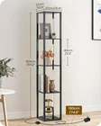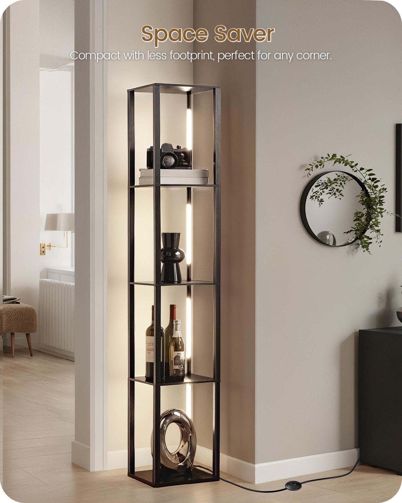 64.2" Floor Lamp with Shelves, Modern Corner Shelf with Light, LED Floor Lamp with Remote for Living Room, Stepless Dimmable Standing Tall Light for Bedroom, Office, Adjustable CCT, Black Product Details Finish Type: Painted Base Material: Wood Bulb Base: Wedge Product Dimensions: 10.6"D x 10.6"W x 64.2"H Item Weight: 10 Pounds Product Dimensions : 10.6 x 10.6 x 64.2 inches; 10 Pounds Item model number : B51LD05 Floor Lamp Date First Available : December 29, 2024 Manufacturer : GOEBLESON Country of Origin : China Customer Reviews: 4.4 4.4 out of 5 stars 21 ratings Finish Type: Painted Base Material: Wood Bulb Base: Wedge Product Dimensions: 10.6"D x 10.6"W x 64.2"H Item Weight: 10 Pounds Lamp Type: Floor Lamp Shade Color: Black Shade Material: Metal Switch Type: Remote Style: Modern Brand: GOEBLESON Color: Black Special Feature: Adjustable Color Temperature, Dimmable, Shelves Light Source Type: LED Material: Wood, Metal Room Type: Office, Kitchen, Bedroom, Living Room, Dining Room Recommended Uses For Product: Office, Reading, Decoration Power Source: Corded Electric Included Components: Remote Control Number of Items: 1 Control Method: Remote Indoor/Outdoor Usage: Indoor Specific Uses For Product: Reading, Indoor use only, Decoration Number of Pieces: 1 Is Cordless?: No Manufacturer: GOEBLESON Part Number: B51LD05 Item Weight: 10 pounds Country of Origin: China Item model number: B51LD05 Floor Lamp Finish types: Painted Special Features: Adjustable Color Temperature, Dimmable, Shelves Batteries Required?: No Date First Available: December 29, 2024 Adjustable Color Temperature & Stepless Dimming: The corner floor lamp features an adjustable color temperature from 3000K-6000K, easily switch between warm light, natural light, and cool white light with a single tap. Seamless dimming and 1/2/4/8 hour timer make it ideal for reading, relaxing, or romance 4-Tier Storage & 360 Rotating Light Poles: The display stand with 4 wooden shelves offers ample storage space for phones, books, photos, figurines, plants, and decor. Equipped with 360 light poles, it can direct lighting where needed, great for a living room corner or bedside Minimalist & Modern: Sized 10.6L x 10.6W x 64.2H, the shelf floor lamp with a slim profile takes up minimal floor space and fits into narrow areas. Its sleek and stylish design enhances various decor styles, such as mid-century, vintage, rustic, and farmhouse, etc. Remote & Foot Control: This shelf floor lamp has a remote and a foot switch for independent control. The remote control rang is 33FT, allowing easy light adjustment. Tap foot switch to change color, long press to adjust brightness, and with memory function, it saves your preferences Easy to Install & Safety: Our floor lamp with shelves comes with a twist-to-lock frame, a illustrated instruction and clearly labeled parts. Simply follow the steps to assemble the lamp pole and shelves. It also includes an anti-tip device to ensure stability and safe use, pets and kids friendly