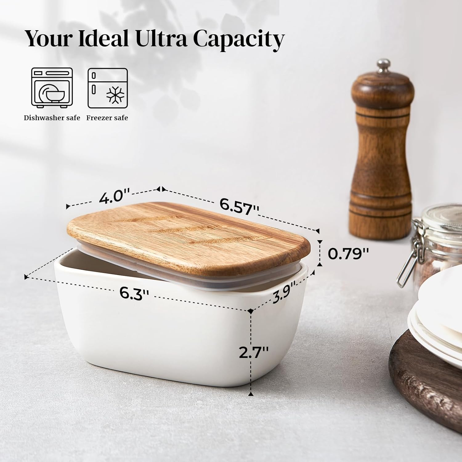 Large Butter Dish Holds Up to 3 Sticks : The inside dimensions of the lid are approximately 6.5" by 4", so it can hold 3 sticks of eastern-style butter stick (4.75" x 1.25") or a standard western-style butter stick (3.5" x 1.5"). Suitable for the whole family to use. Keep Butter Fresh for Longer: The butter dish with lid features a high-quality sealing silicone ring that helps keep butter fresher and longer and won't absorb the flavors of other foods in the refrigerator. Decorate Your Kitchen:The DOWAN butter dish with lid for countertop comes in six stylish colors and the natural acacia wood lid adds a rich texture, making it the perfect addition to any kitchen that will never go out of style. Healthy and Durable Ceramic: Ceramic butter dishes are the safest to use because they don't contain leachable lead or cadmium. DOWAN Butter dish is made with high-quality ceramic that has been fired at high temperatures, ensuring it's safe for dishwasher and long-lasting. Perfect Gift Choice: The DOWAN Butter holder comes carefully packaged in a box and is ready for gift-giving, whether to yourself or someone you love at Father's Day. Plus, it's dishwasher safe, making for easy cleaning. Product Description This beautiful enamel butter dish with wooden lid is perfect for keeping the butter in. The natural solid beech lid keeps the butter covered as well as keeping out air and light which spoils the butter. Stylish enough to keep on the kitchen side ready to spread over a slice of toast. DOWAN Porcelain Butter Dish Perfect for your Countertop Durable and non-stick porcelain: DOWAN insists on adopting good porcelain material, which can greatly prevent the crack, the chip, the fade, etc. Upgraded Silicone Seal: DOWAN constantly upgraded the silicone seal dozen of times, aims to provide the BEST storage room for the butter. Large Capacity & Universal Size: Suitable for most brands’ butter, which is wide and deep enough to hold 8 oz or two 4 oz sticks of butter. Dimensions: 6.5"L x 4"W x 3.1"H Accommodates all short and long butter sticks Lid helps keeps butter fresh and protected Premium porcelain material & BPA free A must-have accessory for butter lovers Why choose the DOWAN Porcelain Butter Dish with Lid? They are safe for freezer, microwave, dishwasher and oven as well (EXCEPT the wooden lid). The wooden Lid is Hand-wash only, Keep it dry after cleaning. Works great With sugar, coffee, salt, spices, seasoning, and cookie jars. The most ideal gift for your family, lover and friends to neaten kitchen counter easily. This dish is as practical as it is attractive, as it keeps your butter fresh while allowing it to soften up for easy spreading. Notes Dishwasher safe only for dish not the lid, the lid only wash by hands. Please do not clean with steel wool as it may cause abrasions over time. Please do not soak the lid in water for a long length of time as this will cause the wood to expand. Premium Material & BPA Free Made of premium AB porcelain, Chemical free so you won’t worry about BPA or harmful substance getting into your body. The butter will not be tainted by other odour, keep fresh and tasted. You have no trouble to handle greasy wrappers and to wipe off spilled butter. Upgraded Silicone Seal Sealed lid allows you to keep butter, margarine, and other shelf-stable condiments on counters and tables instead of inside the refrigerator so it stays soft and easily spreadable at room-temperature Durable and Non-stick Porcelain Durable porcelain and silicone seal can effectively prevent the spoilage of foods. Airtight lid keeps butter fresh in the fridge without mixing other foods’ taste.