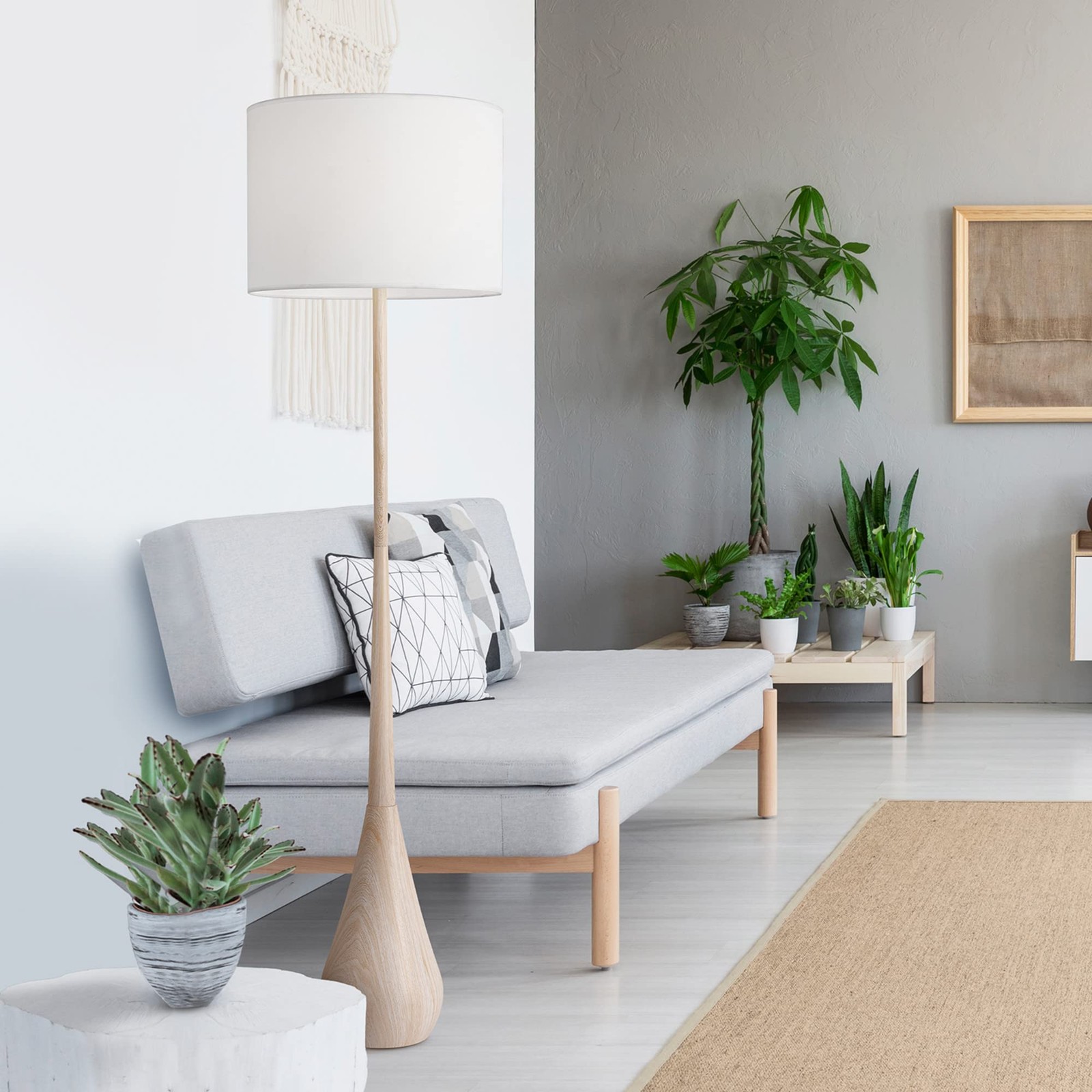 JAPANDI STYLE DESIGN: Faux wood finish and white cotton drum shade bring nature-inspired warmth and minimalist appeal to your interiors. SOFT, RELAXED LIGHT: Fabric shade diffuses light gently to create a cozy, welcoming atmosphere in living rooms, bedrooms, and reading spaces. TALL, SLIM PROFILE: 65-inch height is ideal for placement next to sofas, beds, armchairs, or desks without overwhelming the space. USER-FRIENDLY FEATURES: Equipped with an easy-to-use rotary socket switch and 5-foot clear cord for flexible positioning and effortless control. BULB COMPATIBILITY: Fits 1x E26 medium base bulb (60W max, sold separately); supports LED, incandescent, or smart bulbs for customizable lighting.