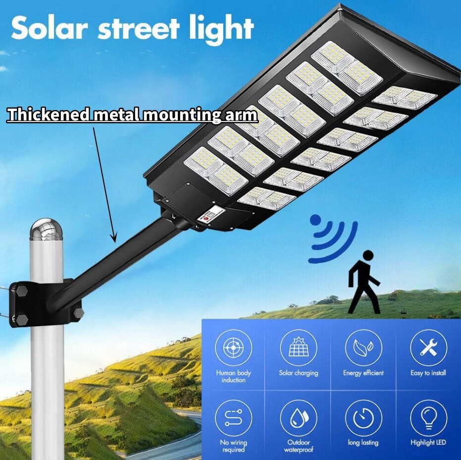 【Super Bright Solar Street Light】2600W solar street light uses high efficiency 960 pcs 5730 high bright long lifespan SMD lamp beads, 300000 Lumens are extremely bright and have low light decay. With a 240 degree wide-angle lighting design, which can provide lighting range up to 3800 square feet and brighter compared with ordinary street lights. 【NO Electricity Bill】This solar parking street light provides 6500K daylight white light and is equipped with 800 PCS super bright LED beads and a 3.2v-48000mAh battery (with a life of up to 50,000 hours). The IP67 waterproof commecial grade makes it work well even in bad weather all year round. It is solar powered street light, produces no electricity bill, automatically turns on at dusk and turns off during the day, and can provide continuous lighting for up to 30 hours (when fully charged). 【3 CONTROL MODES】1. Motion Sensor: keeps 30% power lighting until motion is detected, automatically adjusts to 100% power lighting, and then returns to 30% power brightness after the person leaves for 20 seconds; 2. Timed Lighting: Timed 100% power brightness Lighting for 2/3/5/6/8 hours; 3. Always Lighting: Always 100% power brightness lighting (in this mode, you can adjust the brightness of the street lights to 25%-100% brightness). 【Easy to Install, No Wiring】The package contains 2 kinds of mounting screws and accessories, as well as solar light arm poles. The LED street lights are easy to install, with screw fixing and dependable operation without the need for wiring or trench. You can install solar lights on walls, trees, light poles, etc., wherever you want to install them (support street light post diameter: 1.5 to 4 inches, suggest height 18-25ft). 【Reliable After-Sales Service】offers 24 months of after-sales service, ensuring a good purchasing experience for our customers. If you have any questions regarding our solar street lights outdoor, please don't hesitate to reach out to our customer service team. 200000LM Solar street light, 0 electricity bill, Remote control, Light sensing function, Motion sensor 1. solar street light provides super brighter daylight at full night, no electricity distribution, fast charging, energy saving. 2. IP67 waterproof, Can deal with -5°C-70°C temperature and bad weather in daily life. 3. Easy to installation for wall and lamp post, the package contains 2 kinds of mounting screws and accessories, as well as solar light arm poles, applicable lamp post diameter: 1.5~4 inches. 4. Light control + multi-function remote control, turn off and charging during the day, working lighting from down to dawn. 5. The remote control has a memory function, it can turn on and off light, be timed lighting, and adjust motion sensor mode. 6. Continuous working time: More than 12 hours in constant light mode, 20-24 hours in motion sensor mode. 7. 60000mAH large capacity battery, long battery life, can work continuously for 50000+ hours, more than 5 years. 8. Two ways to turn on the light: Button Control + Remote Control. Solar street lights automatically turn off the lights during the day to charge, and turn on the lights at night for work lighting; IP67 Waterproof, can work in all bad weather IP67 Waterproof, can work in all bad weather Make Sure The Solar Light Has Been Fully Charged and The Remote Control Has Battery Already: 2*AAA (Included) ON: Turn ON the light and Always lighting; OFF: Turn OFF the solar light; 25%-100%:Always Lighting 25%-100% brightness; 2H/3H/5H/6H/8H:Timed Light Up Lighting 2/3/5/6/8 hours; 'Radar': Motion sensor mode (When no one is there, 0% brightness lighting of solar lights; 100% brightness lighting when someone passes by; 30% brightness lighting after people leave for 20 seconds); Note:In Always/Timed Lighting mode, if the light is not adjusted for a long time, the brightness of the light will decrease some brightness every 3 hours in order to prolong the lighting time. Q: Can it work on cloudy days? A: Yes, it can work in all environments, but it needs sunlight when charging, otherwise it cannot be fully charged; Q: Why are the lights turned on at night? A: When the solar panel is in the dark (the solar panel cannot detect the light), at this time the green indicator light will be off, and the light can be turned on by the remote control and the button on the lamp; Q: How long can it work on a full charge? A: Always lighting mode can work for more than 12 hours; Motion sensor mode can work for more than 20 hours;