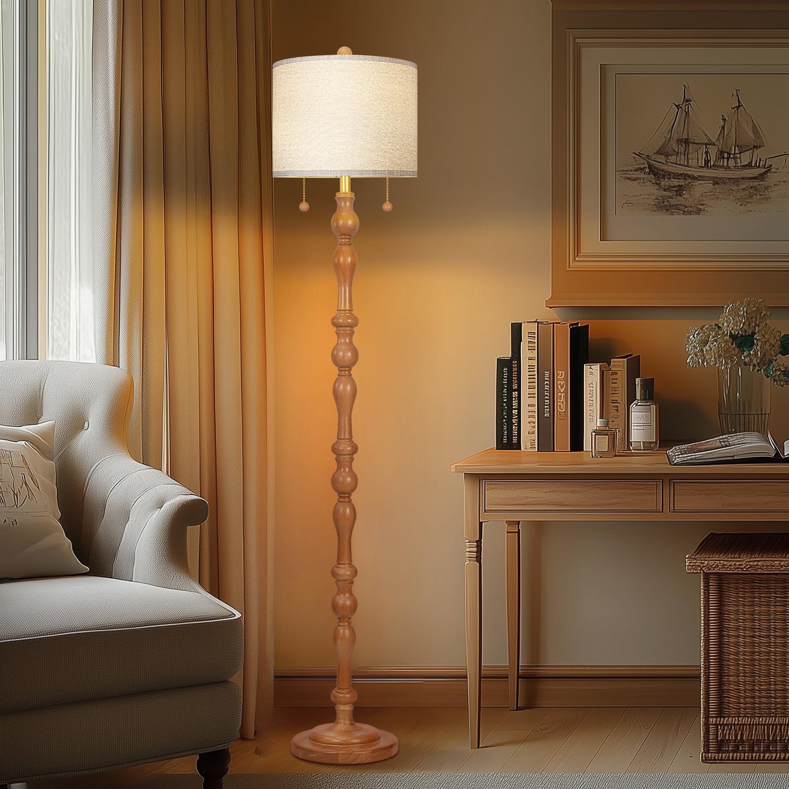 This floor lamp is absolutely stunning! The natural wood gives it a warm, rustic charm that elevates any room. At 65.5 inches tall, it provides perfect ambient lighting, and the dual switch with pull chains makes it super convenient. The vintage country style blends seamlessly with both modern and traditional decor. Sturdy base, beautiful craftsmanship—definitely worth it!