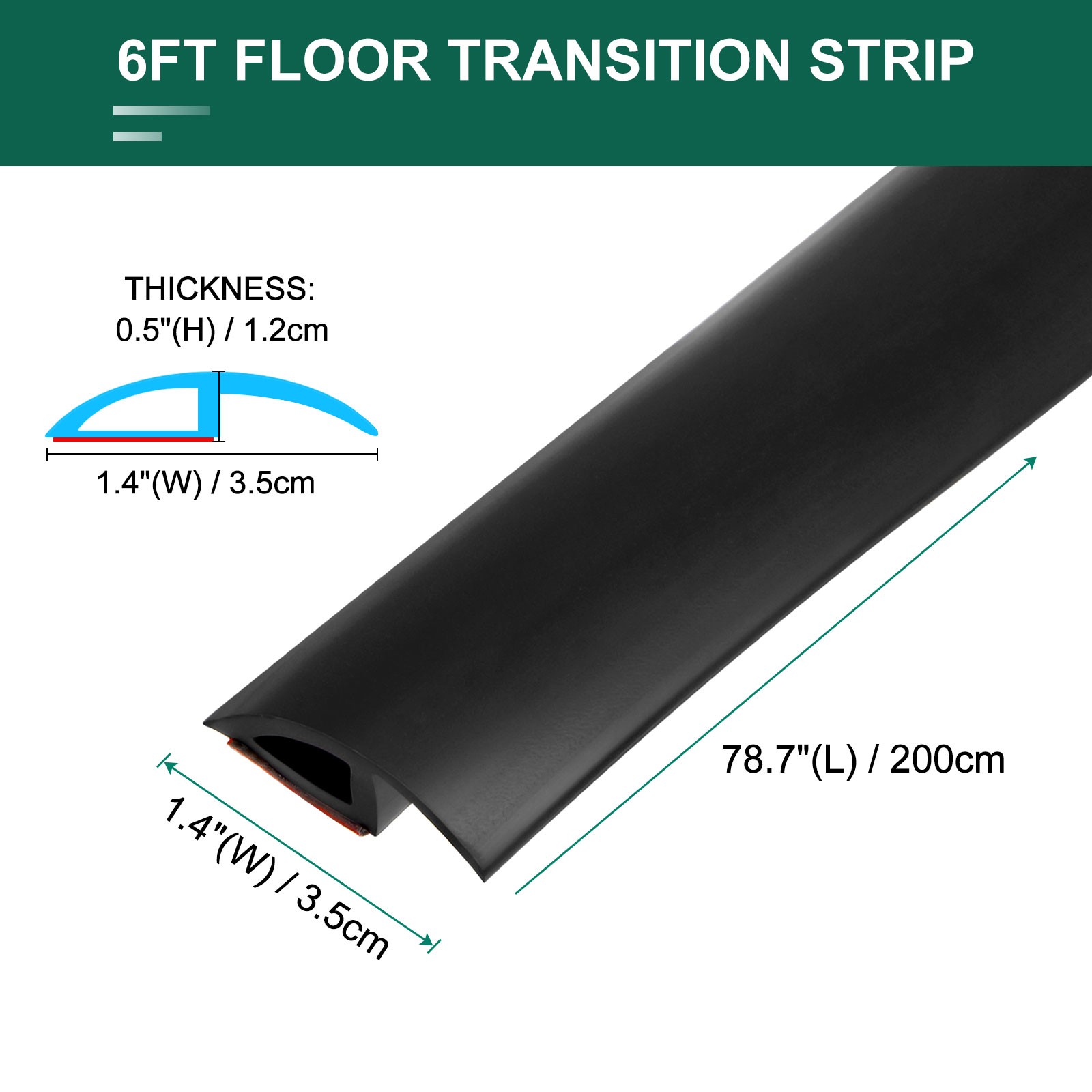 Document Why Choose PVC Self Adhesive Door Transition Strip, Carpet Edging Trim, or Door Transition Sealing Strips?- This Door transition strip is designed to cover and guard the edges of Door tiles or carpet.- Self-adhesive Door transition strip, easy to stick on most Doors, so convenient and practical.- Made of PVC material, waterproof, corrosion resistant and wear-resistant, dust-proof, and safe to use.- It is enough to be easily cut to any size you need, and quickly meet your different needs.- Suitable for various clean and smooth surfaces such as tiles, wood Doors, Vinyl Door, etc.- Wide used in homes, exhibition centers, hotels, restaurants, shops, offices,s and other special occasions.SpecificationMaterial: PVCColor: Black Size: 78.7"(L) x 1.4"(W) x 0.5"(H)/200cm x 3.5cm x 1.2cmPackage Included: 1 pcs x Self Adhesive Door Transition StripApplications: Electronics, hardware tools, crafts, stationery, boards, cars, door frames, photo frames, etc.How To Use:1. wipe the Door with a dry cloth first2. remove one corner of the red film with your fingernail3, press the Door, fixed stick one end4. press the tape while tearing the tape5, until the paste is finished.6, the paste can be stepped up, without waitingNote1. Due to the different monitor and light effects, the actual color of the item might be slightly different from the color shown in the pictures.2. Due to manual measurement, please allow a 1-3cm measuring deviation. 6.56Ft Door Transition Strip Self Adhesive Carpet to Tile Strip Black Why Choose PVC Self Adhesive Door Transition Strip, Carpet Edging Trim, or Door Transition Sealing Strips? - This Door transition strip is designed to cover and guard the edges of Door tiles or carpet. - Self-adhesive Door transition strip, easy to stick on most Doors, so convenient and practical. - Made of PVC material, waterproof, corrosion resistant and wear-resistant, dust-proof, and safe to use. - It is enough to be easily cut to any size you need, and quickly meet your different needs. - Suitable for various clean and smooth surfaces such as tiles, wood Doors, Vinyl Door, etc. - Wide used in homes, exhibition centers, hotels, restaurants, shops, offices,s and other special occasions. Specification Material: PVC Color: Black Size: 78.7"(L) x 1.4"(W) x 0.5"(H)/200cm x 3.5cm x 1.2cm Package Included: 1 pcs x Self Adhesive Door Transition Strip Applications: Electronics, hardware tools, crafts, stationery, boards, cars, door frames, photo frames, etc. How To Use: 1. wipe the Door with a dry cloth first 2. remove one corner of the red film with your fingernail 3, press the Door, fixed stick one end 4. press the tape while tearing the tape 5, until the paste is finished. 6, the paste can be stepped up, without waiting Note 1. Due to the different monitor and light effects, the actual color of the item might be slightly different from the color shown in the pictures. 2. Due to manual measurement, please allow a 1-3cm measuring deviation. Hot Item Payment 1.We accept eBay payment . 2.Payment must be received within 7 business days of auction closing. Shipping 1.We ship to your eBay or Paypal address. Please make sure your eBay and Paypal address is correct before you pay. 2.Items will be shipped within 1-3 business day when we received payment. 3.Delivery time depends on destination and other factors. Description Policy 6.56Ft Door Transition Strip Self Adhesive Carpet to Tile Strip Black Why Choose PVC Self Adhesive Door Transition Strip, Carpet Edging Trim, or Door Transition Sealing Strips? - This Door transition strip is designed to cover and guard the edges of Door tiles or carpet. - Self-adhesive Door transition strip, easy to stick on most Doors, so convenient and practical. - Made of PVC material, waterproof, corrosion resistant and wear-resistant, dust-proof, and safe to use. - It is enough to be easily cut to any size you need, and quickly meet your different needs. - Suitable for various clean and smooth surfaces such as tiles, wood Doors, Vinyl Door, etc. - Wide used in homes, exhibition centers, hotels, restaurants, shops, offices,s and other special occasions. Specification Material: PVC Color: Black Size: 78.7"(L) x 1.4"(W) x 0.5"(H)/200cm x 3.5cm x 1.2cm Package Included: 1 pcs x Self Adhesive Door Transition Strip Applications: Electronics, hardware tools, crafts, stationery, boards, cars, door frames, photo frames, etc. How To Use: 1. wipe the Door with a dry cloth first 2. remove one corner of the red film with your fingernail 3, press the Door, fixed stick one end 4. press the tape while tearing the tape 5, until the paste is finished. 6, the paste can be stepped up, without waiting Note 1. Due to the different monitor and light effects, the actual color of the item might be slightly different from the color shown in the pictures. 2. Due to manual measurement, please allow a 1-3cm measuring deviation. Hot Item Payment 1.We accept eBay payment . 2.Payment must be received within 7 business days of auction closing. Shipping 1.We ship to your eBay or Paypal address. Please make sure your eBay and Paypal address is correct before you pay. 2.Items will be shipped within 1-3 business day when we received payment. 3.Delivery time depends on destination and other factors.