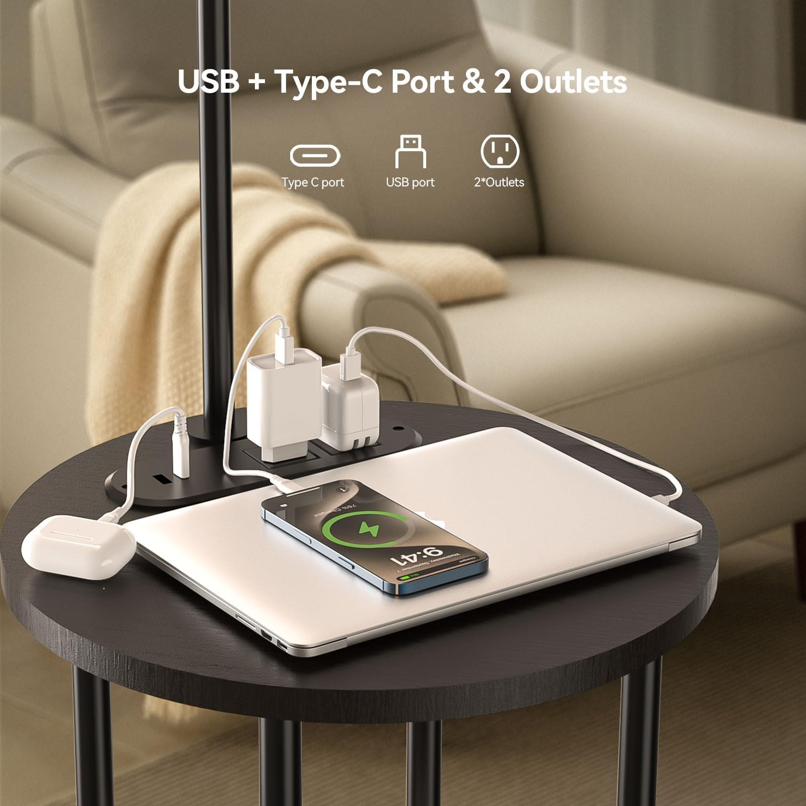 This floor lamp is amazing—bright, adjustable, and packed with features! The 10,000 Lux natural light is perfect for reading, and the 5-level dimming plus 4 color temps let me customize the mood. Love the USB and AC ports for charging devices, and the sturdy gooseneck design lets me direct light exactly where I need it. The remote is super convenient, and the distressed iron base adds a stylish touch. Perfect for my home office—highly recommend!