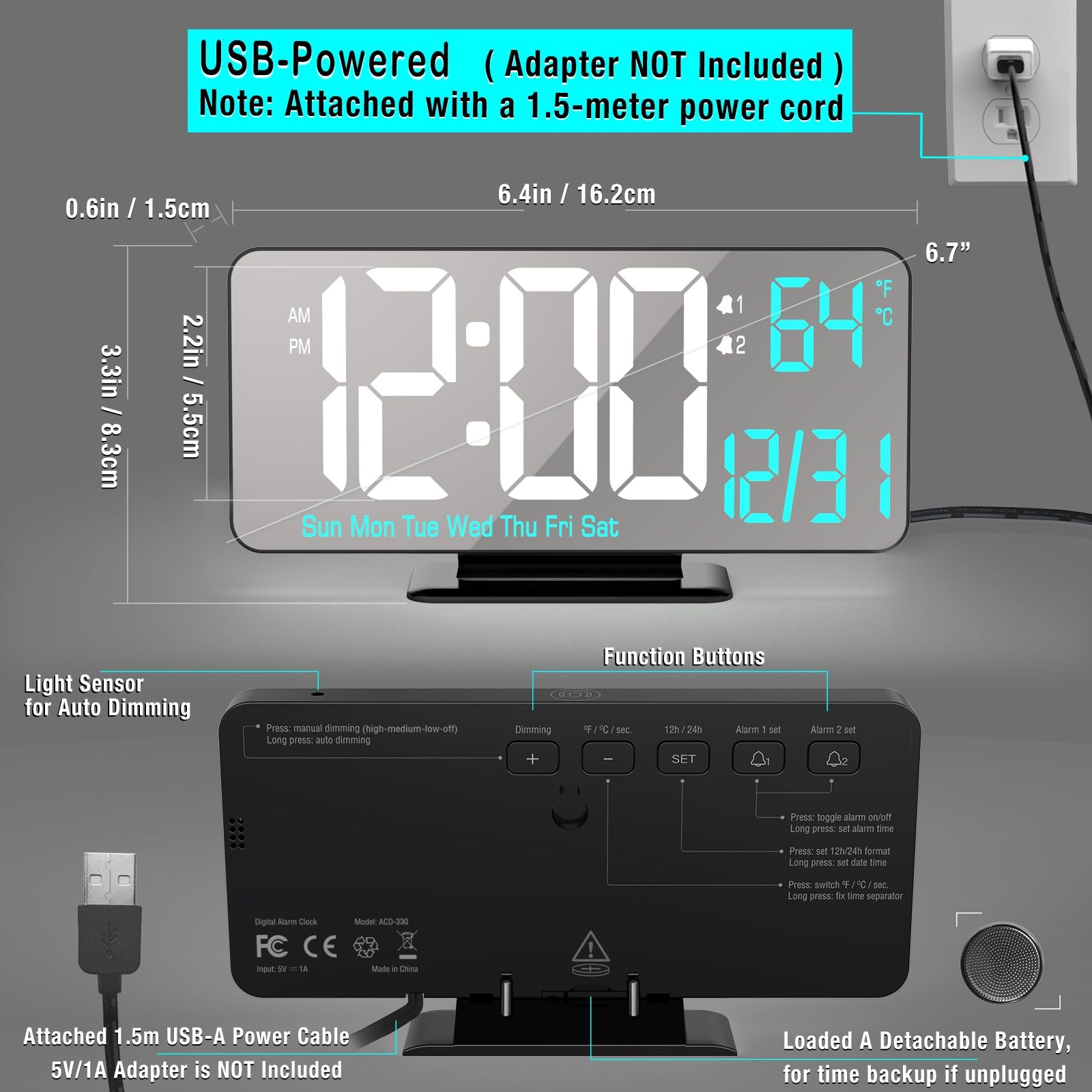 Digital Alarm Clock 6.7in Black Clock for Bedroom, Dual Alarm, Date, Seconds, Day of Week, 12/24h, Dimming, Temp, Desk Clock, LED Clock for Living Room, Calendar Digital Clock [6.7in Black Digital Clock] The black alarm clock features 6.7-inch LED light display with a sleek mirror clock style, which has dual alarms,12/24-hour format, date, day of week, seconds, temperature (℉ / ℃), and auto/manual dimming, it is also a stylish and modern digital calendar for room accessories. Additionally, the bright big white and sky blue digits make the desk clock cool and easy-to-read. [Auto/Manual Dimming] This LED clock features an auto dimming (via light sensor) and manual dimming (low, medium, high, or LED display off) , which makes a cool and customizable element to the digital clock. [Dual Alarm Clock with Snooze] You can set two alarm times for the digital alarm clock, each with 3 different alarm cycles, for workdays, weekends and every day as options. The desk clock also includes snooze function(with 5 mins alarm duration and 5 mins snooze time). [Digital Clock with Time/Date/Week/Temp] This black bedside clock features multi-functional display that includes the time, seconds, date, day of week and indoor temperature, it not only serves as a digital alarm clock but also as a cool digital calendar. Additionally, you can set separate alarms for your workdays, weekends, and every day. [Plug-in USB-A Power Supply] This digital LED clock requires a 5V/1A AC adapter (not included) to operate. It also comes with a button battery, which is only used to preserve the time during power outages and is not meant to be used as a continuous power supply. [Customer Services] We offer a 2-year warranty on our product. If you encounter any quality or usage-related problems, please don’t hesitate to contact us via email. We will promptly assist you in solving the issue.