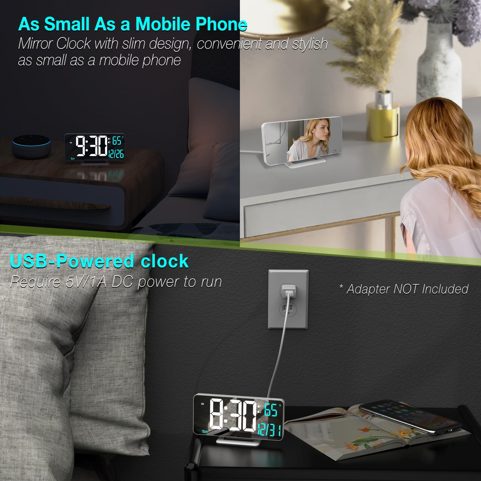Digital LED Clocks for Bedrooms 6.7in White Alarm Clock, Dimming, 12/24h, Date, Day of Week, Temp, White Desk Clock, LED Clock for Bedside, Digital Calendar Clocks for Living Room Essentials [6.7in White Alarm Clock] This stylish LED desk clock features 6.7-inch display of mirror clock style, dual alarms, 12/24-hour format, date, day of week, seconds, temperature (℉ / ℃), and auto/manual dimming, it is also a aesthetic digital calendar and cute alarm clock for bedroom with white and sky blue numbers. Additionally, the bright white and sky blue digits make the desk clock cool and easy-to-read. [Auto/Manual Dimming] The white digital clock features auto dimming (via light sensor) and manual dimming (low, medium, high, or LED display off), which adds a convenient and customizable element to the LED clock. [Dual Alarm Clock with Snooze] You can set two alarm times for the small alarm clock, each with 3 different alarm cycles, for workdays, weekends and every day as options. This desk clock also includes snooze function(with 5 mins alarm duration and 5 mins snooze time). [Clocks with Time/Seconds/Date/Week/Temp] This modern bedside clock features multi-functional display that includes the time, seconds, date, day of week and indoor temperature. This alarm clock not only serves as a table decor LED clock but also as a cool digital calendar. Additionally, you can set separate alarms for your workdays, weekends, and every day. [Plug-in USB-A Power Supply] This alarm clock requires a 5V/1A AC adapter (not included) to operate. It comes with a button battery, which is only used to preserve the time during power outages and is not meant to be used as a continuous power supply. [Customer Services] We offer a 2 years warranty on our product. If you encounter any quality or usage-related problems, please don’t hesitate to contact us via email. We will promptly assist you in solving the issue.