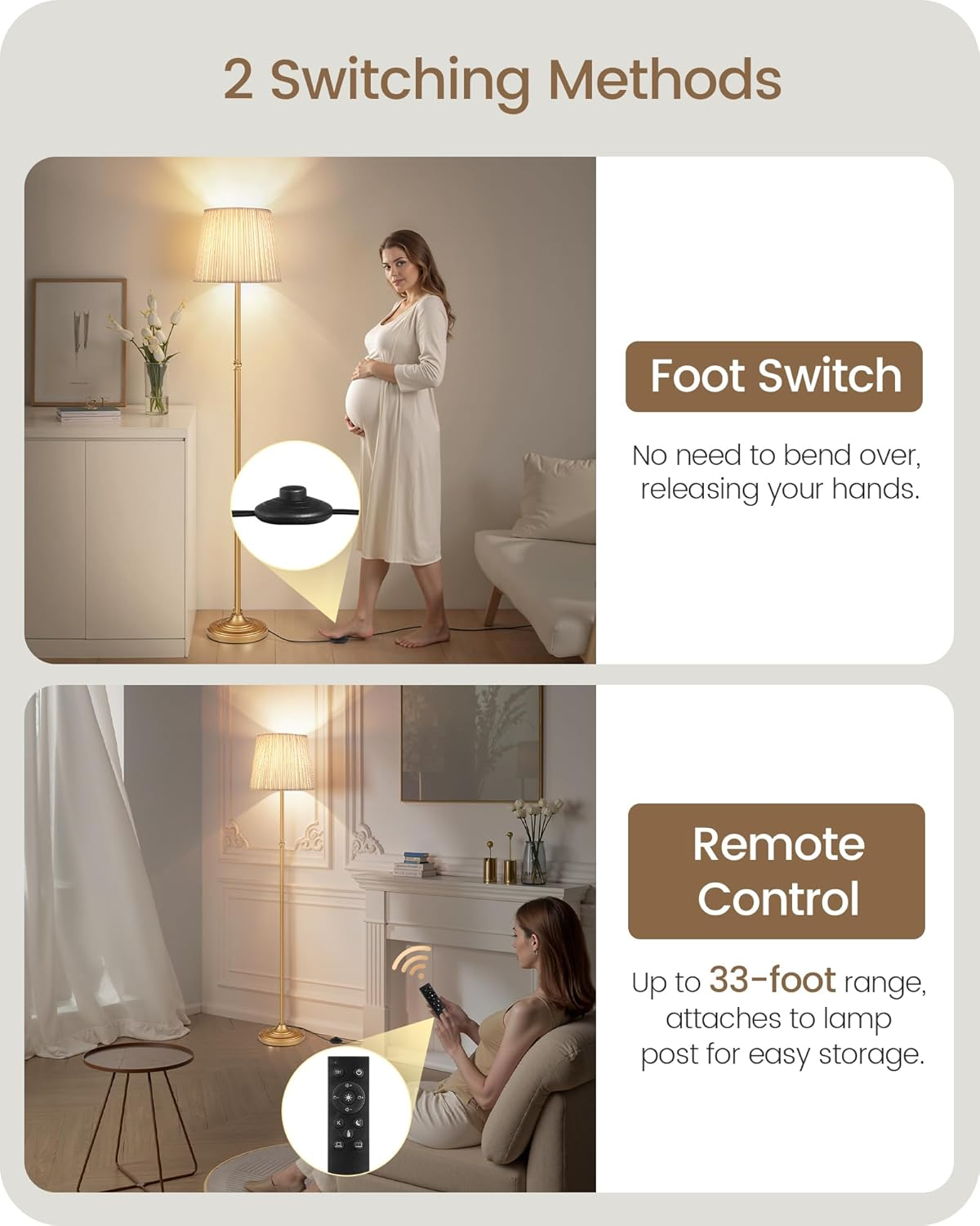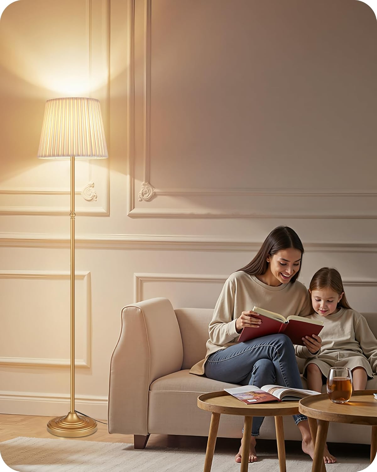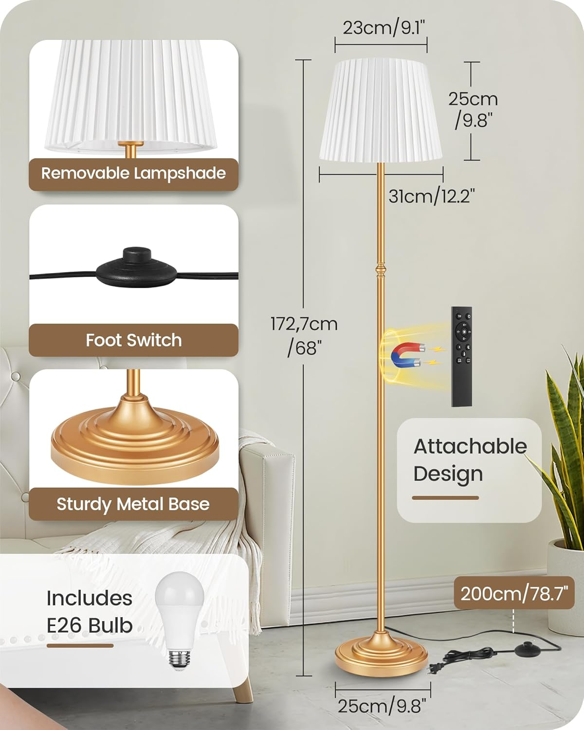 Store New Arrivals Add to Favorite View Feedback Contact Dimmable Floor Lamp for Living Room, 68" Tall Standing Lamp, Reading Light with Remote & Foot Pedal, 10W LED Bulb (3000K-6500K) Included, FCC Listed, Reinforced Base, Gold and White DW12LD05 Description Item model number DW12LD05 floor lamps Light Source Type LED Style Modern Shade Color white Part Number DW12LD05 Color White + Gold Product Dimensions 12.2"D x 12.2"W x 68"H Material Linen, Metal Shade Height 68 Inches Room Type Living Room,Bedroom Item Weight 8.5 Pounds Batteries Required? No Special Features Corded Lamp Type Floor Lamp Special Feature Corded Modern and Stylish Design: The tall floor lamp features a gold metal rod with a white fabric shade. Its minimalist style saves space and effortlessly complements studies, bedrooms, or offices while infusing your space with warmth and comfort Dimmable Bulb Included: The standing lamp comes with a 10W 800LM LED bulb, offering adjustable brightness(10%-100%) and color temperature(3000K-6500K) for reading, working, or resting, creating a personalized lighting experience Remote Control and Foot Switch: The floor lamp can be controlled via the foot switch without bending. The remote control, with 33-foot range, offers various modes(working/babyfeeding/reading/nightlight/timer), and attaches to the lamp rod for easy storage Detachable & Washable Shade: The detachable and foldable shade matches different home styles or special occasions. This innovative design boosts functionality and adds a fresh look. It's easy to clean or replace, keeping dust off and brightness on Sturdy and Easy to Install: Made of sturdy metal rod and a heavy metal base, the reading light is built to last. Illustrated instructions make installation quick and easy. The lamp holder is compatible with dimmable E26 bulbs, offering more lighting options Product Description 1 Living Room 2 Bedroom 3 Kids' Room GOEBLESON Floor Lamp Add to Cart Add to Cart Add to Cart Add to Cart Add to Cart Add to Cart Add to Cart Customer Reviews 4.4 out of 5 stars 10 4.4 out of 5 stars 10 4.6 out of 5 stars 374 4.6 out of 5 stars 374 4.6 out of 5 stars 374 4.6 out of 5 stars 374 4.6 out of 5 stars 281 Price $45.99 $ 45 . 99 $41.99 $ 41 . 99 $24.99 $ 24 . 99 $23.99 $ 23 . 99 $26.99 $ 26 . 99 $25.99 $ 25 . 99 $29.99 $ 29 . 99 Bulb included YES YES NO NO NO NO 1 Bulbs Included Color Gold and White Gold and Pink Pink Black and Gray Black Black and Bule Pink Is Assembly Required Yes Yes Yes Yes Yes Yes Yes Material Linen, Metal Linen, Metal Linen, Metal Linen, Metal Linen, Metal Linen, Metal Linen, Metal Product Dimensions 12.2"L x 12.2"W x 68"H 12.2"L x 12.2"W x 68"H 7.9"L x 7.9"W x 64.6"H 7.9"L x 7.9"W x 64.6"H 7.9"L x 7.9"W x 64.6"H 7.9"L x 7.9"W x 64.6"H 5.8"L x 5.8"W x 66"H ABOUT US We offer the best prices around on high quality products. Our E-store includes media such as books, movies, music and games while offering electronics, toys, sporting apparel, clothing, tools, general home, garden items and more. SHIPPING We are always working hard to ensure your package arrives as soon as possible. Please understand that some factors like weather, high postal traffic, and the performance of shipping companies are outside of our control. We offer free shipping to the lower 48 states and ship within 2 business days of payment, usually sooner. We do not accept P.O. Boxes. Please provide a physical address. For shipping outside of the continental USA, we only use eBay's Global Shipping Program.The item is shipped to KY and then sent to the rest of the world. International customers are responsible for all duties and taxes. Continue to check out in order to calculate costs for shipping the item to your country. Messages regarding eBay's Global Shipping Program MUST be directed at eBay EXCLUSIVELY. RETURNS We offer a 30-Day Return Policy on items which you are not completely satisfied with. You have the option for a full-refund or an exchange of the item. No returns are available on items shipped outside of the USA. PAYMENT We accept PayPal. CONTACT US This page content is yet to come Please ad us to your favorite seller and visit again later Thank You CUSTOMER SATISFACTION We try our very best to make sure every customer is completely satisfied. If there's a problem, message us! We're happy to help.