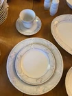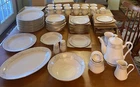 This is a 69 piece set of Tienshan roses with gold trim ‘Regency’ pattern fine bone China in great condition - not a single chip or crack anywhere. (salt & pepper shakers even have the original stoppers) 12 Dinner Plates 10 1/4” 12 Salad Plates 7 1/2” 12 Bowls 7 1/2” 14 Footed Tea Cups and 12 Saucers 6” 1 Coffee (or tea) Pot with lid 1 Creamer, 1 Sugar Bowl w/lid 1 Set of Salt & Pepper Shakers 1 Serving Bowl 9 1/4” 1 Serving Platter 9 3/4” x 14” Prefer to sell as a complete set, but open to offers on individual pieces.