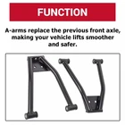 Description This is a 6" lift kit, you can install up to a 23" tire on your cart (Heavy duty rear springs are recommended if the cart is heavily weighted to prevent rubbing with 23" tires). It will work on gas and electric DS model carts (with STEEL HUB COVERS). Specification Color: Black Material: Steel Replaces stock front axle with double A-Arm design Made of powder coated black steel. All high strength hardware included. Includes front and rear lift. Bolt on kit with no any modification. Fits For Club Car DS 1982-2003 Electric or Gas cart NOTE: THIS LIFT KITS CANNOT BE MOUNTED ON PRECEDENT OR CARRYALL MODELS. Package Included 1 Set 6" Double A-Arm Lift K