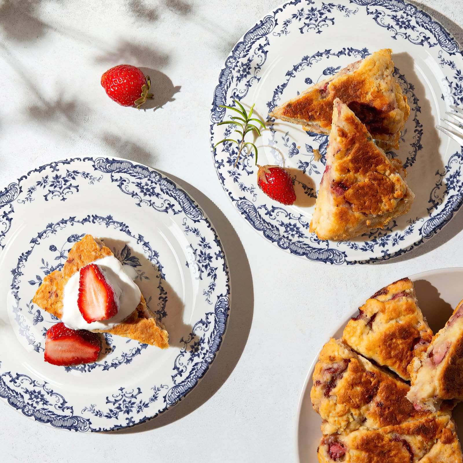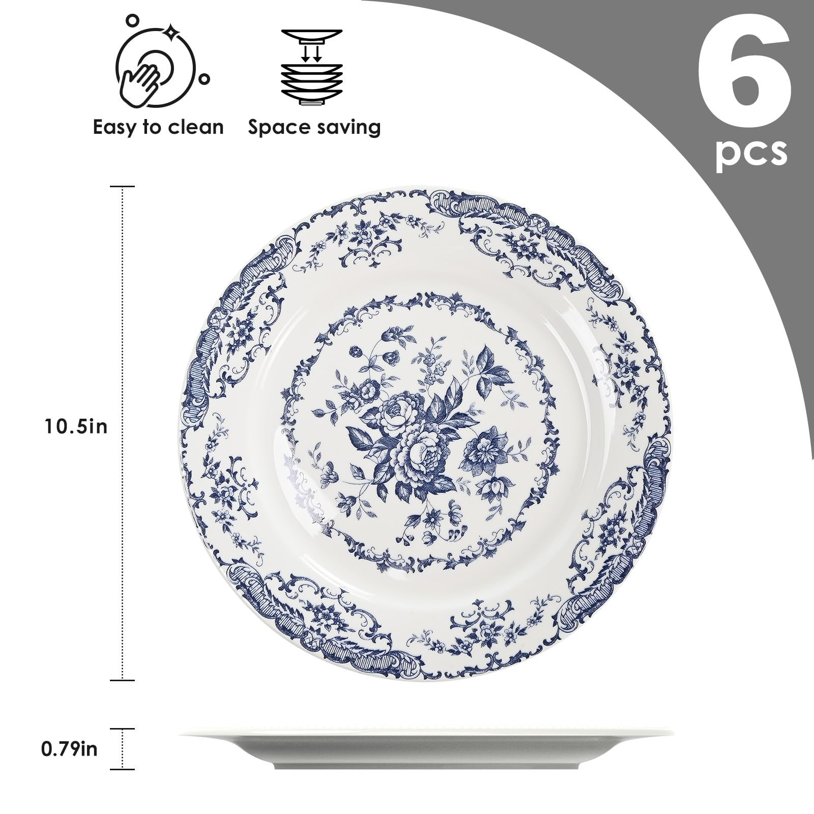 Elegant Blue Rose Design: Our dinner plates feature a beautiful blue rose pattern that adds an elegant touch to your table setting. Whether you're hosting a formal dinner or a casual brunch, the blue rose pattern will impress your guests and create a visually appealing atmosphere. Scratch Resistant: Our dinner plates set of 6 are fired from high temperature porcelain and have excellent durability and scratch resistance, ensuring that they can withstand the scratches of everyday knives and forks. Oven & Dishwasher Safe: Our ceramic dinner plates are microwave, oven, and dishwasher safe, providing you with the utmost convenience in your kitchen. Lead and Cadmium Free: Your health and safety are our top priorities. These kitchen dinner plates burn at 2300°F and are free of lead and cadmium, ensuring that you can enjoy your meals with peace of mind. Perfect Gift: The 10.5-inch dinner plates set offers ample space for your culinary creations. This set also makes a thoughtful gift for housewarmings, weddings.