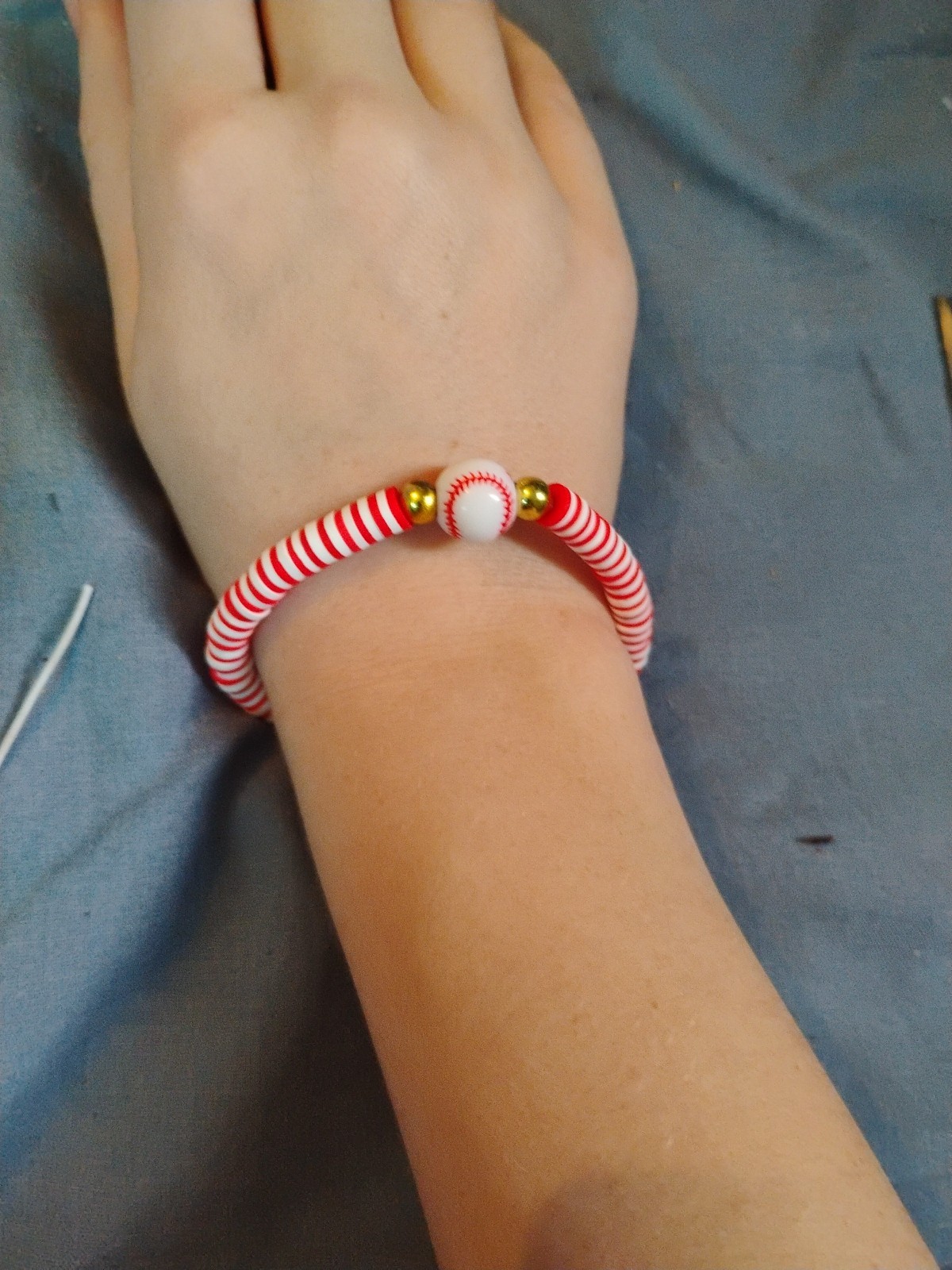 This bracelet is such a cool and unique piece! The white and red heishi beads give it a clean, sporty look, and the baseball bead adds a fun touch. It's lightweight, comfortable, and well-made—perfect for any baseball fan or someone who loves simple, stylish accessories. Definitely a great addition to my collection!