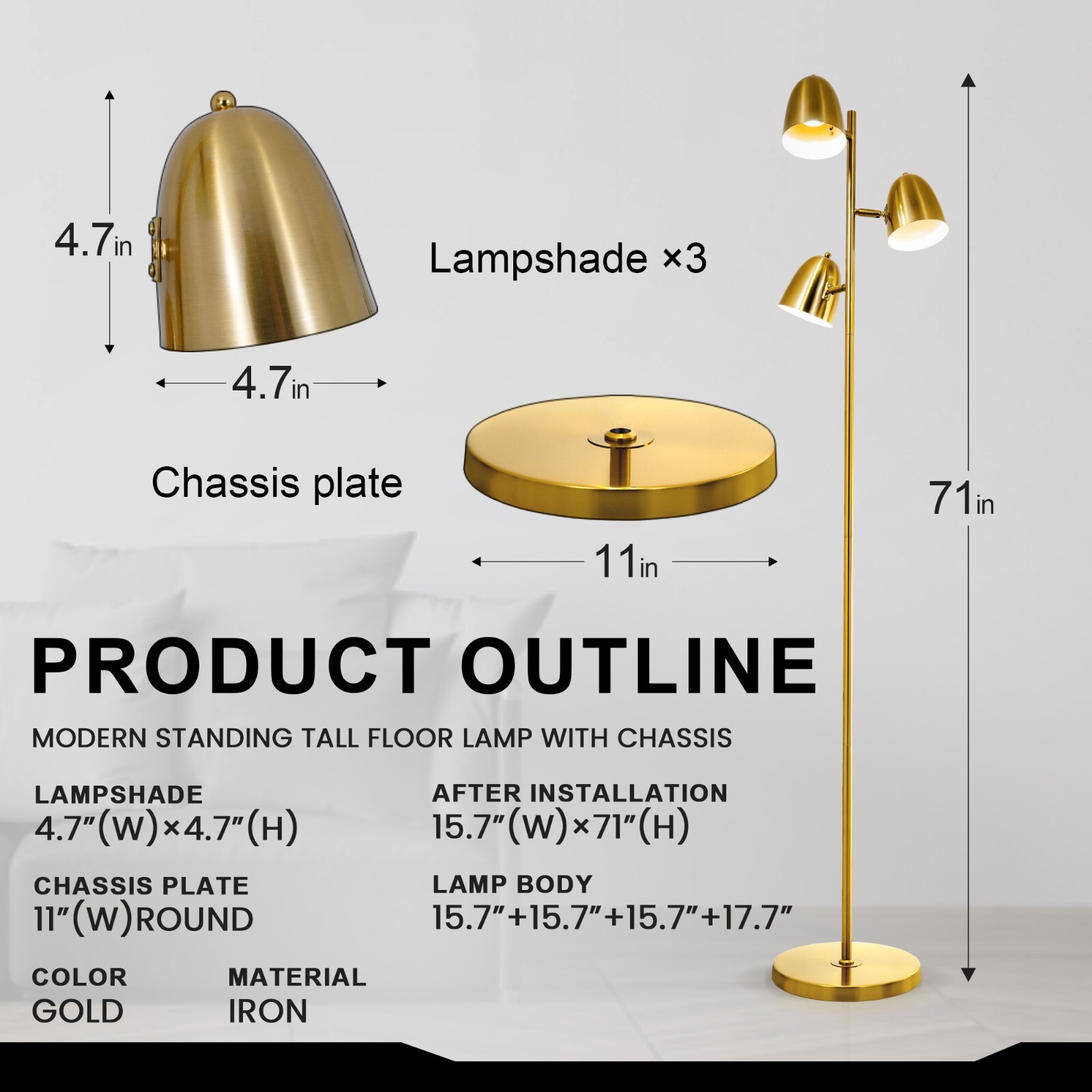 Features: Size after installation:Width:15.8",Height:70.8" Color:Gold Product Weight:13 lbs Voltage: 110V Number of Lights: 3-light Light Source: GU10 base bulb(NOT included) Suggested Room: Dining room, living room, bedroom, foyer, office, kitchen, storage room. The crystal chandelier is made of high quality materials, including crystal and metal. 71" Tall Standing Floor Lamp Gold Pole 3-Lights Rotatable Foor Light Fixtures Features : Size after installation:Width:15.8",Height:70.8" Color:Gold Product Weight:13 lbs Voltage: 110V Number of Lights: 3-light Light Source: GU10 base bulb(NOT included) Suggested Room: Dining room, living room, bedroom, foyer, office, kitchen, storage room. The crystal chandelier is made of high quality materials, including crystal and metal. About this item 【Flexible Adjusted Lamps Head】 The lampshade of this tree standing floor lamp can be adjusted up and down by 90, rotated horizontally by 360 to meet your different needs. Standing tree lamps fit well with modern, casual, and artistic decor styles. Standing floor lamps are suitable for living room, bedroom, office, study, bar, club, restaurant, etc. 【3 Independent Rotary Switches】We put a separate rotary switch at the top of each lampshade of living room lamp, so you can turn on/off the single lamp you need. If you turn on all lamps, you will get the brightest brightness. You can put the floor lamp in the living room, bedroom, office or corner to create an elegant and warm atmosphere for your family. Standing lamps for living room is suitable for your families and friends! 【Bulb Specifications】Floor lamp for dining room is featured standard GU10 base bulb sockets,it need 3Pcs LED Bulbs(Bulbs Not Included). Different bulbs will bring different visual effects to the bedroom floor lamp. 【Sturdy Industrial Floor Lamps】This 3 light rustic standing tall lamp is made of high-quality metal, the base and pole are heavy and stable, ensuring stability even on carpets. Gold standing tall lamps fit well on your desk, sofa and bedside. Stand up lamps bring tall visual effects when creating an artistic ambiance in your room. 【Easy to Install】Our tall lamp is very easy to assemble, you can complete the assembly in a few minutes. The light source of this black floor lamps for living room is stable and doesn't flicker, and the light creates a soft and smooth atmosphere, which can effectively prevent eye fatigue. Payment Delivery details Terms of sales About us Contact us Payment You could make payment via: Delivery details Packages will ship via by UPS or USPS within our handling time,once the package is shipped out ,normally shipping takes about 3-10 working days,but due to different cities and states,shipping time will be different. Terms of sales If you any problem about shipping information, or the item you got : Arrived damaged; Wrong item sent; Missing parts or pieces; Doesn't work or defective; Doesn't match description or photos. Pls click "Contact Seller" and send us message firstly. Then we could have a check and will take responsibility to resolve the problem with you in good communication. About us Our company specializing in selling all kinds of light fixtures,such as ceiling fans,chandeliers,crystal lights,retro lamps,pendant light,etc. If there's any light fixture you are interested,pls feel free to contact us for more details. Contact us Normally your message will be replied in 1 business day,If after 24 hours you do not receive our reply,please kindly re-send us the message,because sometimes ebay message system will have technical problem,so your message can't send to us successfully. Number of Settings 1 Character / Power Source Corded EC Range A+++ - G Color Gold MPN Does Not Apply Material Metal Brand Unbranded Department Adults Type Floor Lamp Sensor Type Light Energy Star 3 Stars Voltage 110 V Style Industrial Theme Floor Lamp Shade Shape / Room Bedroom, Dining Room, Home Office/Study, Kitchen, Living Room Finish Metallic Character Family / Lighting Technology GU10 Features / Pattern / Control Style Button Control