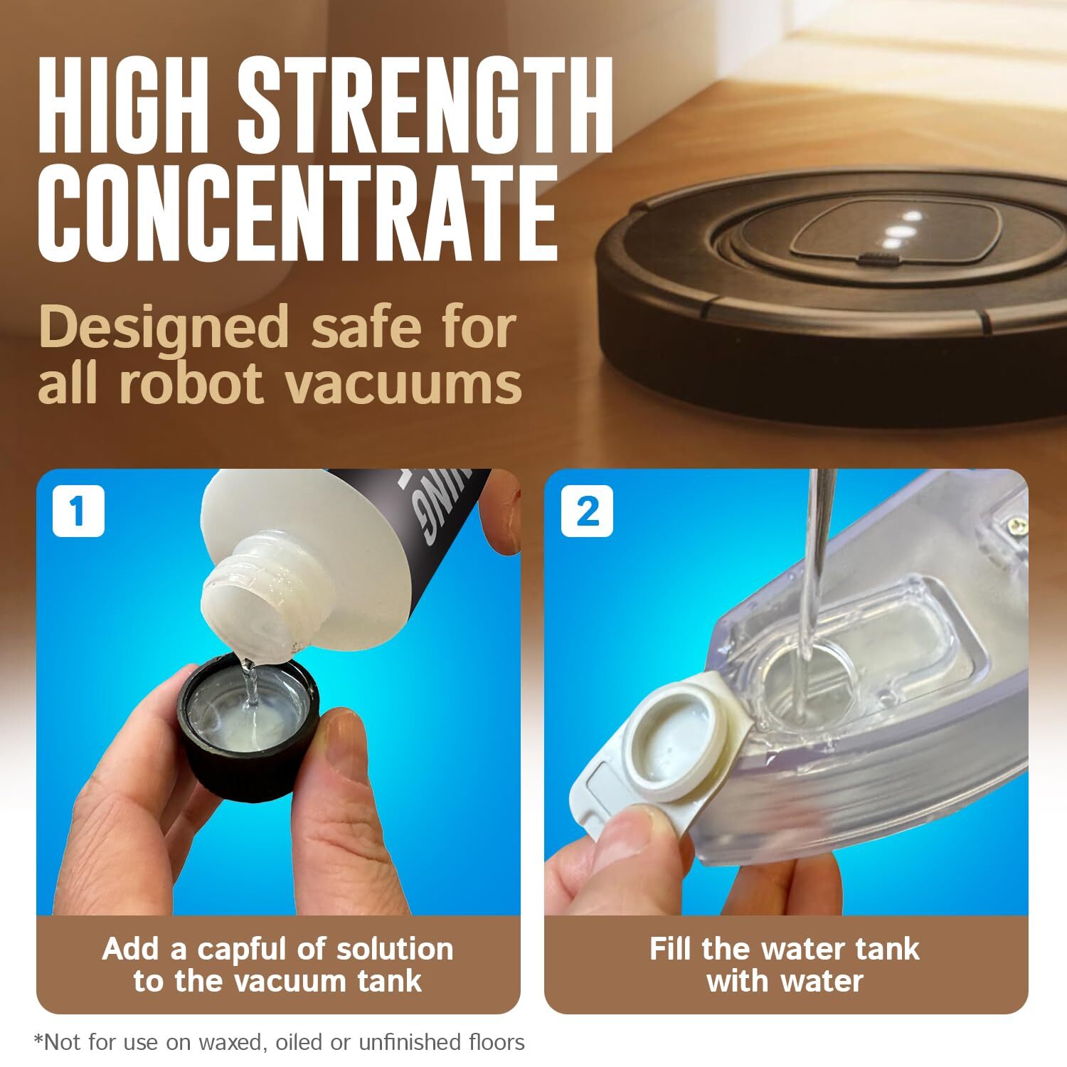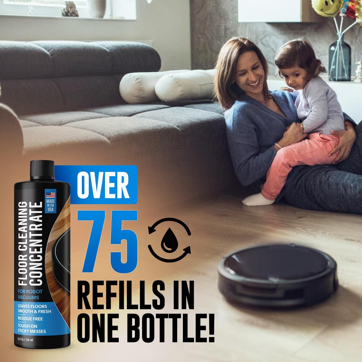 Safe to Use With All Robot Vacuums: Formulated to work with all robot mops without any added oils or foaming agents, Floor Cleaning Concentrate is a quick and easy answer for all your floor cleaning needs. Compatible with Braava Jet, Roborock, Tineco iFloor, Ecovac, Bissell Crosswave, Hoover Powerdash, Jashen M12, ionVac HydraClean, Dyad and more Over 75 Refills in One Bottle: With our high strength floor cleaning solution, it only takes one capful to clean your floors over and over. Simply add cap of concentrate to your water 300ml tank, fill the rest of the tank with water and let your robot mop do all the work. For larger 3,000ml+ tanks, use 3-4 caps of cleaner and fill with water One Solution for Every Floor: Restore the natural color and beauty of your hardwood floors and clean and shine laminate, vinyl, tile, linoleum and ceramic surfaces without leaving any residue. Not for use on waxed or oiled floors Clean Ingredients & Clean Floors: Floor Cleaning Concentrate is a water-based non-toxic solution made from plant-derived ingredients, dries fast and is safe for people, pets and children Made in the USA: Floor Cleaning Concentrate is produced and bottled in the USA, ensuring it meets the highest quality standards. We take pride in knowing our customers get the best possible product