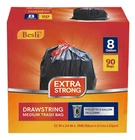 8 Gallon Black Drawstring Trash Bag,90 Count Drawstring Bin Bag Trash Can Liner 【Eco-friendly & No Smell】8 gallon trash bag is made of high quality pure LDPE material. Good toughness, tensile resistance, environmentally friendly and no odor, safe for daily use 【Much Thicker & Ultra Strong】With the thickness of 0.9 mil, our 8 gallon garbage bags are super durable. They are strong enough to hold all kinds of garbage without tearing, leaking and puncturing 【Convenient Double Layer Drawstring Handle】Designed with the durable double layer drawstring,make these bin liners are strong and tough enough to hold garbage up to 22 lb. Quickly tighten the drawstring to lock the smell within the bags,And easy to lift and carry it to the trash can. 【Convenient Quick-dispense Design】Designed with the Quick-dispense box, and apply with the no perforation technique, make it very easy and convenient to pull out the trash bag, save you the time and trouble of tear and tug. 【Multipurpose-More Than A Trash Bag】You can use these bin liners for general household waste,office waste and food waste in the kitchen bathroom office dining room and more; You can use it for collecting pet’s litter or baby diaper; If you like,you can also use it to store blankets, books ,clothes ,toys and organize your holiday decorations.
