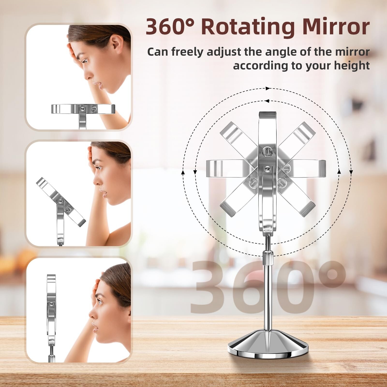 Omobolanle 8" Lighted Makeup Mirror, 10X Magnifying Mirror with Light 360° Rotation Double Sided Mirror with 3 Color Lights Brightness & Height Adjustable Rechargeable LED Light Up Mirror Silver Product Details Color: Silver Size: 12.5"L x 7.5"W Brand: Omobolanle MPN: DM-DB8-005 UPC: Does not apply EAN: Does not apply Brand: Omobolanle Room Type: Bathroom, Living Room, Bedroom, Home, Office Shape: Round Product Dimensions: 12.5"L x 7.5"W Frame Material: Metal Brand: Omobolanle Room Type: Bathroom, Living Room, Bedroom, Home, Office Shape: Round Product Dimensions: 12.5"L x 7.5"W Frame Material: Metal Style: Modern Mounting Type: Dresser Mount Finish Type: Polished Surface Recommendation: Glass Special Feature: 360 Degree Rotate, 10x Magnifying, Color Changing, Dimmable, Lighted, Height Adjustable, Double Sided Mirror, Cordless Mirror, Rechargeable Color: Silver Theme: Makeup Specific Uses For Product: Makeup and Illumination Number of Pieces: 1 Number of Items: 1 Material: Metal Frame Type: Framed Assembly Required: Yes Frame Color: Silver Magnification Maximum: 10 x Manufacturer: Shenzhen Ruxin Technology Co., Ltd. Size: 12.5"L x 7.5"W Item Weight: 2.59 pounds Item model number: DM-DB8-005 Batteries: 1 Lithium Polymer batteries required. (included) Date First Available: May 7, 2024 1X/10X Magnifying Mirror with Light: Our makeup mirror with lights and magnification, the 1X mirror can let you to look all face and easy to make up. The 10X magnifying mirror lets you do precise facial treatment more easily. Such as deep facial-cleaning, plucking eyebrows, blackhead removal and wearing contact lenses. Note: the distance between the face and the lighted magnifying mirror should be less than 4 inch, avoid image inversion and distortion Upgrade Makeup Mirror Height Adjustable: Lighted makeup mirror with magnification can adjust height from 13.2-16.7 inches, let you find the most comfortable angle to makeup. The makeup mirror with lights suitable for makeup desk and wash tables of all heights, Allows you to avoid injuries caused by bending over. Desk mirror's flexibility makes it perfect companion for all your beauty needs Dimmable and Adjustable Colors Makeup Mirror: The LED mirror is with sensitive touch button, long press to dimmer light and touch to switch the light color. There are 3 colors modes(cold/natural/warm), meets all of your make up needs in different occasions. Even in dim environment, with the help of LED lights, you can better finish your makeup via the mirrors 2000mAh Rechargeable Battery: The mirror for desk is built in 2000mAh rechargeable battery, continuous work time 4-5 hours when fully charged. There is type-C cable can be used to charge the lighted mirror through USB contact power bank, PC, etc. Note: The charger is not included Cordless Make Up Mirror: The make up mirror with lights is cordless design, built in battery, allows you to move to bedroom, dressing room, bathroom, and anywhere. Detachable design, can take lighted mirror wherever you want when travel. Such as hotel, spa, beauty salon, and so on 360Swivel Double Sided Mirror: The double mirror design allows for the best viewing angle. The mirror with lights is connected to the bracket with hinges, can freely rotate 360, and rotate the light up mirror to any position to accommodate your makeup position Used Widely: Our lighted makeup mirror is a 8 inch size, providing a large and high-definition wide-angle field of view. The makeup mirror with lights is not only a professional make up mirror, but also a desk lamp, night light, atmosphere light, etc., can be used in home, bathroom, hotel, spa, beauty salon, etc Gift for Women/Girls/Wife: This is make up mirror with lighting is the perfect gift for your wife, girl friend, mother, makeup lovers in any special days, such as Birthdays, Valentine's day, anniversaries, Christmas, Mother's Day, New year and more. If you have any questions about the product, can contact us by email and we will replace it for free Easy To Install: The LED makeup mirror is made of the mirror, base and pole. When adjustable height, only unscrew the nut slightly, pull out the above pole then screw back the nut. Note: restore the height, hold the above part to avoid sudden drop down Customer Support: We stand behind the quality of the makeup mirror, offer 12 months warranty and 30 days refund guarantee. If you are not completely satisfied with your purchase, please contact us. We will provide you with a solution that meets your needs. Omobolanle customer service team is available 24/7 to assist you with any questions or concerns you may have