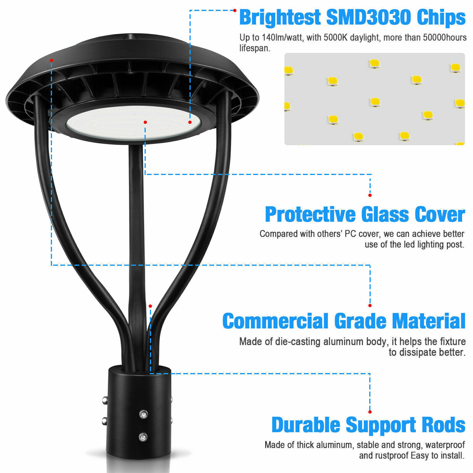 Product Description 80W LED Garden Street Circular Area Post Top Light DLC ETL Listed 400W MH Equal Light Up Larger Area - The 80w light post bring 8100Lm with SMD3030 chips, up to 135lm/watt, AC 100-277V universal voltage and 120°beam angle. 5000K color temperature of lighting is a nice choice for street light illumination. Anti-shock, anti-moisture, no glare, no strobe light, no ghosting, protecting your eyes. Excellent Performance - High power factor >0.9, more than 50000hours lifespan, reduce your electricity consumption, save your electronic bill. Provides a continuous, efficient outdoor lighting environment. Commercial Grade Material - The DLC/ETL Listed post pole light fixture made of die-casting aluminum body + protective glass cover. The scientific design helps the exterior light post top to dissipate better, achieve the best use of the led lighting post. IP65 waterproof for drying, wet environment, sandstorms, snowstorms, and harsh weather conditions. Wide Application - The circular post top design give the lamp a uniform brightness and can be applied to a variety of outdoor scences, such as pathway, street, front yard, city expressway, trunk/rustic road, factories, playground, school, garden, courtyard, parking lot, public park, walkway, exterior, driveway, store, farmyard or any other commercial and industrial area. Installation and Warranty - The pole mount of our post area light fits for a 2 3/8-inch OD tenon & less than or equal to 3 inch standard pole, very easy to install and transfor(Please see the video on the product page for more installation info). KUKUPPO offer you lasting safety and reliability backed by a 5-year warranty. For a bulk order, email us in advance to get a different offer. Specifications: Rated Wattage: 80W Luminous Flux: 10800Lm Color Temperature: 5000K Protection Grade: IP65 Material : Aluminum Body+Glass Cover Input Voltage : AC100-277V 50/60Hz Dimension: Dia 460x625 mm Base: 2 Pins Wire Power Factor: >90% Beam Angle : 120 degrees Average Lifetime : More than 50000 hours Flexible Installation The pole mount of our post area light fits for a 2 3/8-inch OD tenon & less than or equal to 3 inch standard pole, very easy to install and transfor Commercial Grade Material DLC/ETL Listed quality. Scientific design helps the exterior light post top to dissipate better, achieve the best use of the led lighting post. Durable Support Rod Made of thick aluminum, stable and strong, waterproof and rustproof. High performance quality provides with lasting safety and reliability. Ultra Bright LED Chips With SMD3030 chips, up to 140lm/watt. Anti-shock, anti-moisture, no glare, no strobe light, no ghosting, protecting your eyes. Kindly Note Please note that the light can not be used IN the water. Please confirm the wire connection is right while installing. About Us Payment Shipping Returns Contact Us SHENZHEN NUOGUAN TECHNOLOGY CO. LTD founded in 2010. We are high-technology comany specialized in manufacture Commercial and industrial LED light. Advanced production equipment and excellend R&D ability help us to combining service ,production sell together provide top-level products to our customers. 1. Payment is expected within 7 days of auction close. Or Unpaid Items will be forfeited per eBay . 2. Taxes may be applicable at checkout as states adopt new laws and regulations regarding sales tax collection. 1. We ONLY ship to USA . 2. Orders processed within 1-2 business day of payment verification. There’s no Delivery service or courier service on Saturdays, Sundays or Public Holidays. 3. We have 3 different warehouse in US,so due to stock status and time differences, we will choose to ship your item from our first available warehouse for fast delivery. 4. We offer Free Shipping within the Lower 48 states! All packages are sent via UPS or USPS.The delivery time for UPS Ground is typically 2-5 business days. We strive to ensure 100% satisfaction for each and every one of our customers. we offer a 30-day 100% money-back guarantee on all eBay orders. If your item isn't just as you wished, simply send it back to us and we'll refund or replace your item. Please note that all returns must be authorized by our Customer Service department. please contact us though message first if you have any problem. USA Warehouse. Fast shipping! We are appreciated your purchasing form our eBay store. Office Time: 9:30 - 18:30, Monday - Saturday (UTC+8) Please contact us with eBay Message. We will respond you within 24 hours on business day. About Us SHENZHEN NUOGUAN TECHNOLOGY CO. LTD founded in 2010. We are high-technology comany specialized in manufacture Commercial and industrial LED light. Advanced production equipment and excellend R&D ability help us to combining service ,production sell together provide top-level products to our customers. Payment 1. Payment is expected within 7 days of auction close. Or Unpaid Items will be forfeited per eBay . 2. Taxes may be applicable at checkout as states adopt new laws and regulations regarding sales tax collection. Shipping 1. We ONLY ship to USA . 2. Orders processed within 1-2 business day of payment verification. There’s no Delivery service or courier service on Saturdays, Sundays or Public Holidays. 3. We have 3 different warehouse in US,so due to stock status and time differences, we will choose to ship your item from our first available warehouse for fast delivery. 4. We offer Free Shipping within the Lower 48 states! All packages are sent via UPS or USPS.The delivery time for UPS Ground is typically 2-5 business days. Returns We strive to ensure 100% satisfaction for each and every one of our customers. we offer a 30-day 100% money-back guarantee on all eBay orders. If your item isn't just as you wished, simply send it back to us and we'll refund or replace your item. Please note that all returns must be authorized by our Customer Service department. please contact us though message first if you have any problem. Contact Us USA Wa