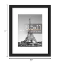 CLASSIC & DURABLE: With sturdy frame, high definition cover, safe packing, picture frame will protect your photo and give a clear view. DOUBLE SIZE DESIGN: Black 8.5x11 inch picture frame perfects for Pictures 6x8 with Mat or 8.5x11 Without Mat. The display size will be 0.5inch smaller than the photo size to better stable the photo and prevent it from falling off. EASY MOUNTING: Spring type action to remove the backing, can be hung horizontally or vertically. GIFT & BE MERRY: 8.5x11 frame set not only the simple yet classic design for any home or office decor, but also a heartfelt gifts for everyone. INTACT PARTS AND PACKING: Protective Packaging let you don't have to worry about receiving damaged products
