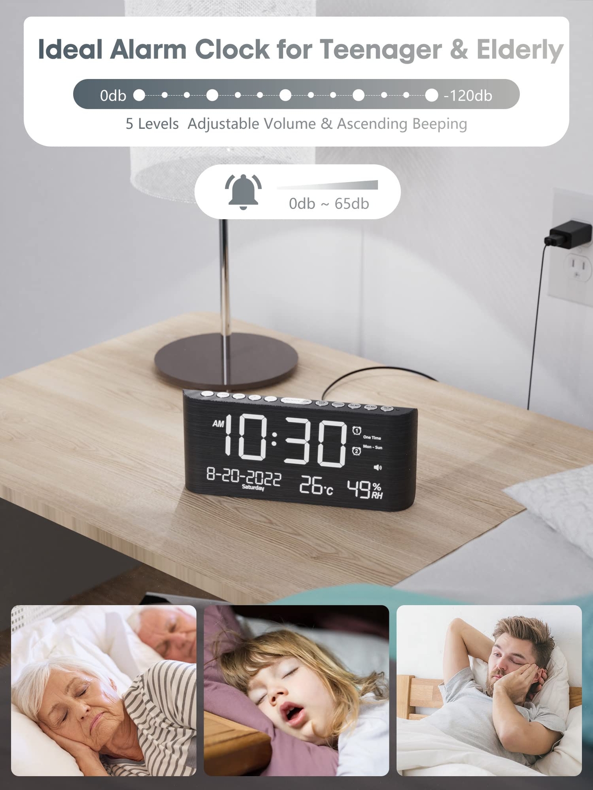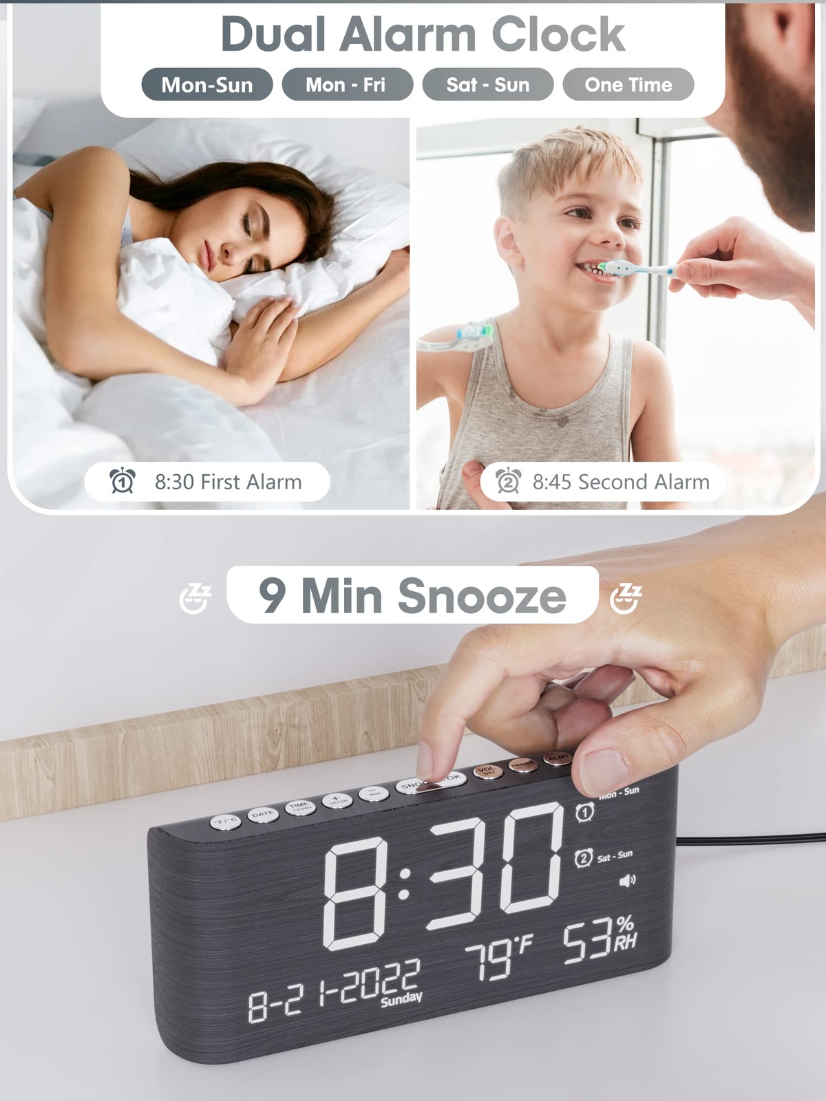 Raynic Alarm Clock, 8.7 Inch Digital Clock,5 Adjustable Volume Calendar Clock with Type-C Charger,Dual Alarms,Temperature, Humidity,Date,and 5 Dimmer for Bedroom Living Room Office (Grey) Compact Desk Clock Easy to Use: This clock for bedroom is easy to set, even the elderly and kids can set it up themselves without any issues. With a Type-C and USB charging port, DST and 12/24 hours formats switchable, and 9 min snooze funciton, this alarm clock with a modern wooden look only takes up a little space of bedside table, which is the ideal alarm clock for bedrooms, living rooms, and offices. Dual Alarms with 4 Mode Options: Customizable alarm settings of the digital clock meet the wake-up needs of each individual and different family members. You can set 2 separate alarms in 4 modes of Weekdays, Weekdends, Everyday and One Time to wake up different family members, or you can get a second reminder that it's time to go to work or school. 8.7" Digital Clock with Temperature and Humidity: The date clock with large LED numbers, even the elderly and visually impaired can read easily. Providing accurate dates and times helps avoid missing any important meetings and anniversaries. This clock also can keep track the most accurate indoor temperature and humidity, and allow you to know the time, temperature and humidity of the day with just a glance. Adjustable Brightness and Volume: The day clock has 5 levels of adjustable brightness, you can dim the display to your liking. This digital alarm clock is perfect for those who are sensitive to light, helping them to have sweet dreams all night long. Also with 5 levels of volume options, the volume of the alarm clock can be set from 0-120 dB. With the gradual ringing tone, this bedside clock can not only gently wake up the elderly and children, but also loud enough for heavy sleepers! Support Type-C and USB Charging: Raynic digital calendar clock provides Type-C and USB charging ports, which can be compatible to charge more electronic devices, help you conveniently charge your phone or other devices simultaneously while sleeping and help reduce the number of outlets used within your bedroom significantly, making it a neater environment. Note: This is a Non-battery-powered Clock, 2 AAA batteries (not included) are only used to remember time and alarm settings when power outage Raynic modern wood alarm clocks feature a natural wood grain, each with a unique surface texture. It would be an ideal birthday, Christmas, New Year gift for those who are looking for unique decor for their bedroom, living room, or office. SHIPPING Domestic Buyers - We have confidence in our products, but if you are not fully satisfied please contact us within 30 days of purchase and you will get full refund. - We ship within 3 business days of payment, usually sooner - We offer FREE shipping on all orders! - We only ship to the lower 48 states, no APO/FPO addresses or PO Boxes allowed International buyers – please note: Import duties, taxes, and charges aren't included in the item price or postage cost. These charges are the buyer's responsibility. - Please check with your country's customs office to determine what these additional costs will be prior to bidding or buying. * Order Cancellation Policy ** You can return a product for up to 30 days from the date you purchased it. 1. The seller reserves the right to cancel the special case only due to eBay cancellation fee. 2. The decision of seller is the final. 3. The seller will respond to the cancellation request within 2 business days. Please wait for the result of cancellation. 4. In case the cancellation is not completed by some reasons, the buyer can follow the options below to get the refund. 4.1 The buyer can reject the item when it arrives. 4.2 The buyer can send the item back to the seller within 30 days If the buyer receives item (USA Shipment ONLY). The seller will provide the FREE return label to the buyer when the buyer opens " Return Item" case on eBay by using the reason as "Change my mind" ONLY. 5. When buyer has placed the order. The order will be processed and completed by automatic warehouse system within 5 minutes. In case that buyer sends the cancellation request after 5 minutes of placing the order, the request will be rejected. **Sending direct message to cancel the order is not allowed for every case.* Return Policy For the return case - If buyer would like to return the items for refund or replacement, please CONTACT SELLER to receive the free return label from seller. The refund or replacement will be processed with the tracking number of return label which is provided by seller only. The other ways of return which are not approved by seller will not be processed for the refund or replacement.
