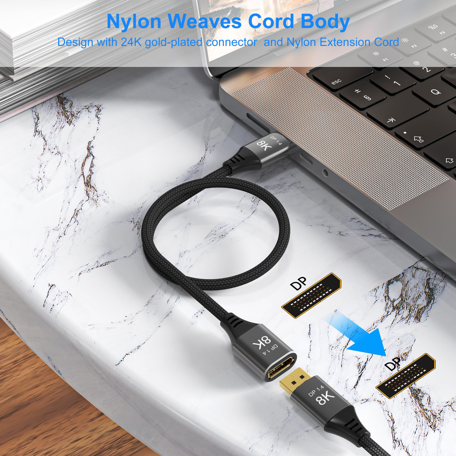 【8K High Resolution,DP1.4 Standard】- This Displayport extension cable supports 8K ultra-high resolution and is backwards compatible with 4K @ 144Hz, UHD and HDR. Upgraded to DP1.4, is also compatible with DP1.2 version. With a maximum bandwidth of 32.4 Gbps, signal transmission is smooth and stable. With HDCP 2.2 / Dynamic HDR / DPCP1.0 / DP++ / DSC / FEC / MST / HBR3 and more, you can enjoy perfect high frame rate video and multi-channel audio and stereo presence. 【Signal Extension and Freedom of Movement】- This DisplayPort extension cable connects a DisplayPort-compatible laptop or PC to a monitor/TV/projector equipped with DisplayPort inputs. A convenient accessory for extending the connection between DisplayPort input/output terminals, it provides stable transmission and can be applied when DisplayPort cable lengths are insufficient, giving you more freedom when wiring. It helps to increase the distance to the screen and expand the range of movement. 【Superior Stability and Durability】- DisplayPort extension cable has a 24K gold-plated connector that resists corrosion and oxidation. Assembled with an aluminum shell and copper foil spot welding, it provides better protection for internal materials and stable signal transmission. Made of flexible PVC and cotton braid, this DisplayPort extension cable is waterproof, handy and durable. No worries about failure or signal degradation, even after prolonged use, ensuring excellent durability. 【Wide Compatibility】: DisplayPort Extension Cable compatible with devices with DisplayPort terminals. DP input destinations can be connected to laptops, mainframes, etc., and DP output destinations can be connected to monitors, displays, projectors, etc. is a brand that specializes in the production of DisplayPort /USB/HDMI cables, we committed to providing quality products and services for customers, please us if you have any questions.