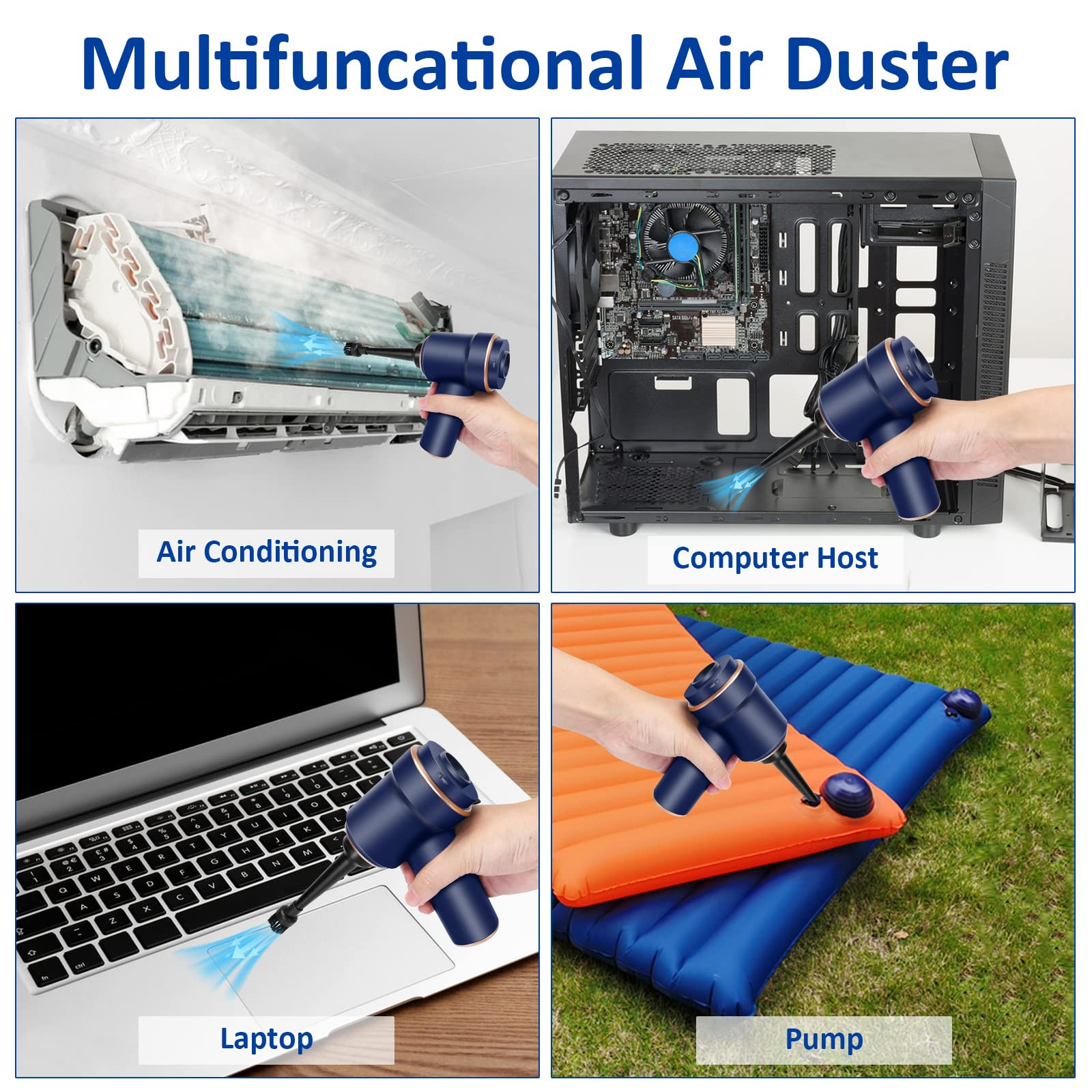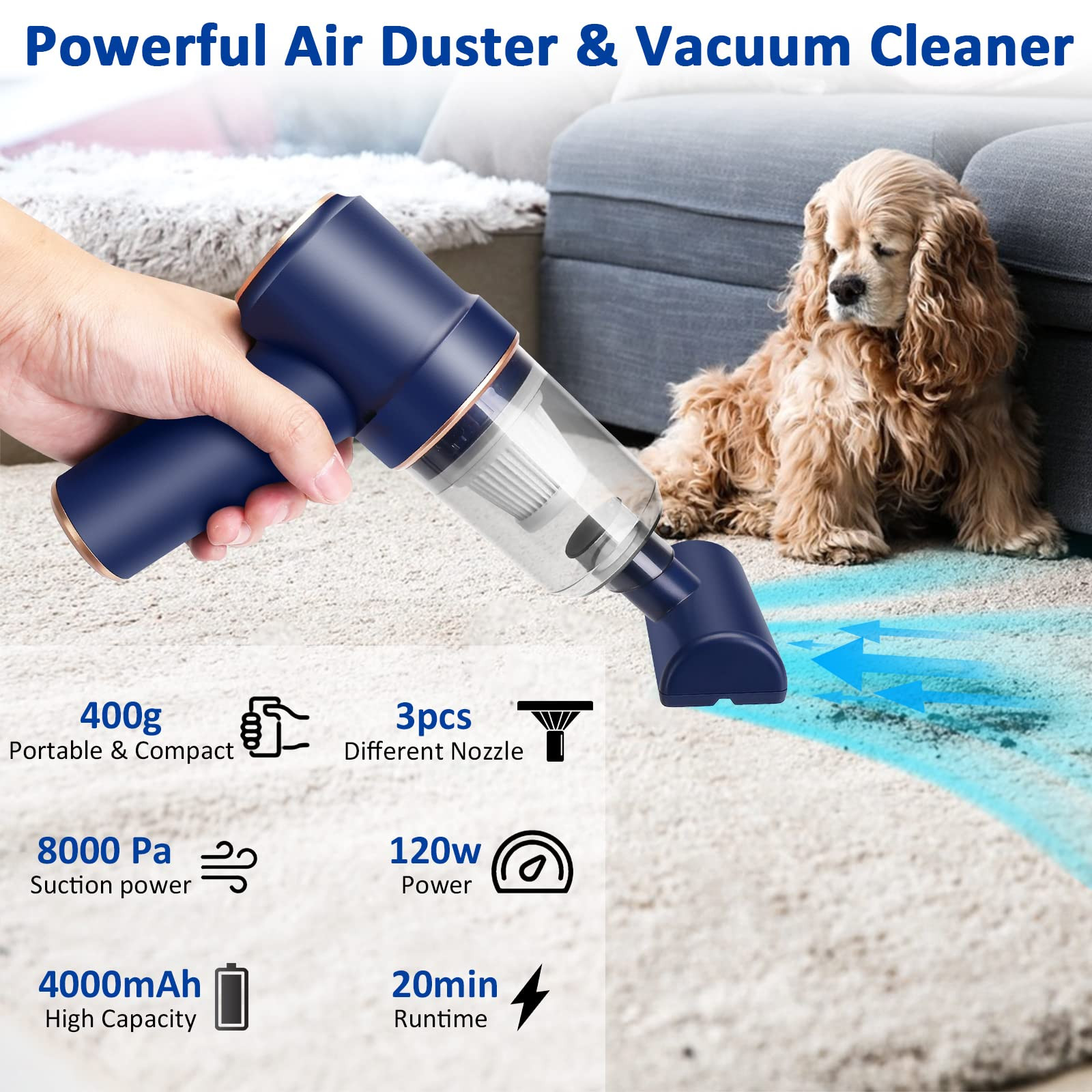 【Handheld Vacuum Cordless】A portable mini vacuum Cleaner that weighs only 400 grams, 8000pa high suction, with a nozzle brush and light, perfect for cleaning dust and debris in localized areas or crevices. This is a good mini vacuum for desk, desktops, keyboards, computers and cars! 【Sucking & Blowing Function】The desk vacuum with air dusting function, one end of the accessory connection is for vacuuming effect. The other end is for the blowing function, as an air duster, the extended blowing nozzle concentrates suction to deeply clean. 【Rechargeable Mini Vacuum Cleaner Base】 Handheld Vacuum Cordless is powered by a 4000mAh battery, 140w high-power motor, fully charge in 4 hours. The Keyboard vacuum cleaner have two charging methods: charging base for home and office, charging and storage. Usb cable, more convenient to use in the car. 【Multi-Nozzles & Washable Filter】In addition to the regular nozzle, this Handheld Vacuum also comes with a wide mouth nozzle for cleaning carpets, sheets or sofas.HEPA filter can be washed and reused. The filter is easy to assemble and disassemble,washable and reusable。If the car vacuum filter is full of dirt or the suction power is weakened, please clean the filter or fully charge it in time to ensure that the dust collector can work properly. 【Package】Cordless handheld vacuum comes with 3 nozzles, and 2 brushes, 1 filter, 1 usb cable, and 1 charging stand. If you have any dissatisfaction If you have any dissatisfaction with this cordless handheld vacuum, please feel free to contact us, we are always there.