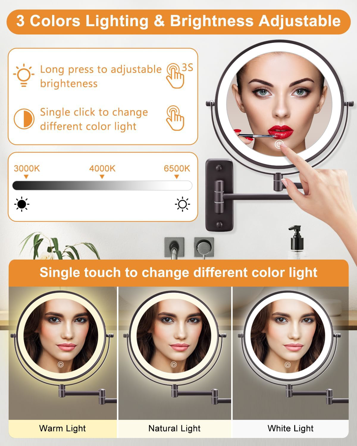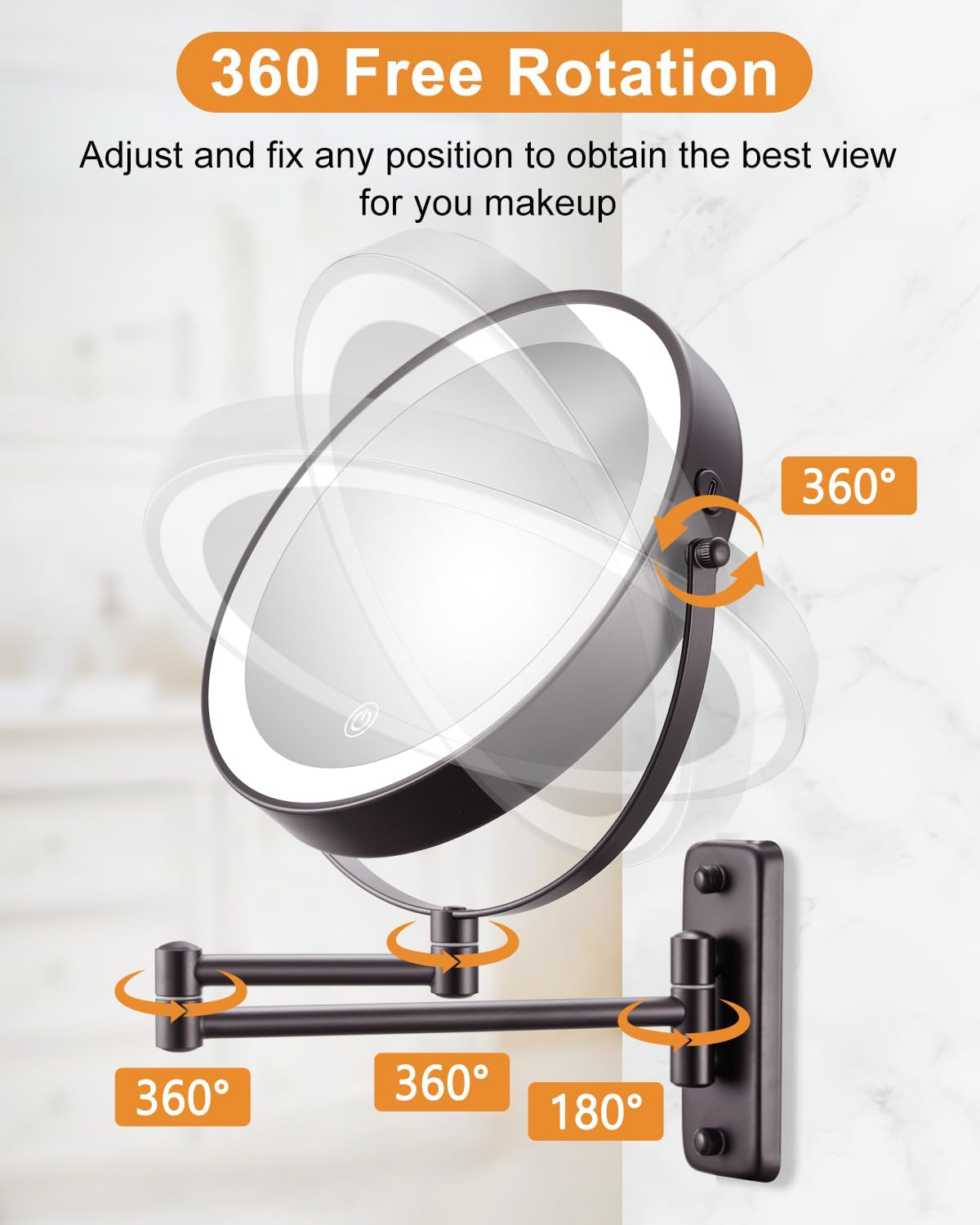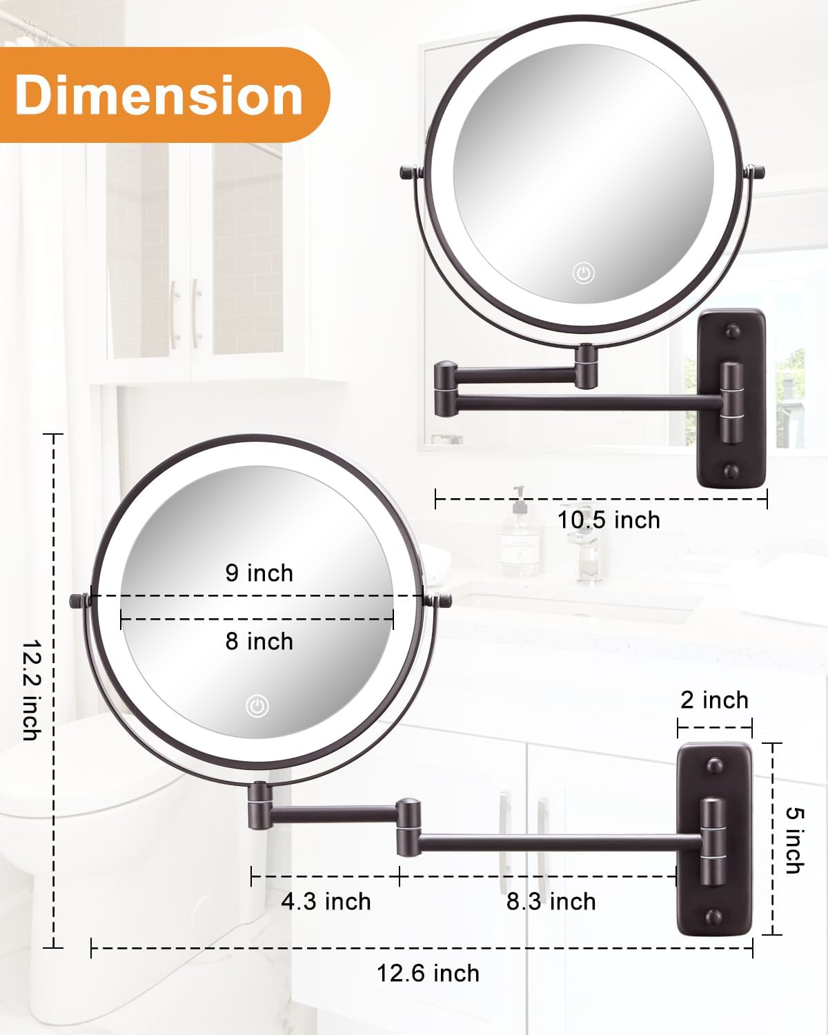 Fast Shipping Great Customer Support Satisfaction Guaranteed DESCRIPTION Shipping Shipping Shipping All domestic packages are shipped for Free (Unless other shipping method was selected during the checkout) Most items ship and arrive much sooner than the estimate delivery date. Usually within 2-3 days from payment. However, we have longer estimates to compensate for the occasional delay or supply chain breakdown. We do not accept P.O. BOXES - PLEASE PROVIDE A PHYSICAL ADDRESS Return Return Return In the event that you would like to return your purchase, we allow returns that are processed within the defined return date (the return date is to be found in the return policy/shipping and handling section) Please contact us for a return authorization and the return shipping address. Payment Payment Payment PayPal is our preferred method of payments it's the quickest, easiest and most secure way to pay for your goods or services online. PayPal offers buyer and seller protection should there be a problem. If you do not have a PayPal account, to get started and buy your first item with us is very easy. Simply click on the 'Buy It Now' button and follow the eBay checkout steps. Select PayPal as the payment method you then will be given the chance to enter your card details in to PayPal's secure checkout in order to pay for your order. Once the payment has been made, you will then be given the opportunity to make your own PayPal account to make paying for your items in the future very easy. Should there be a problem with payment please do let us know. Feedback Feedback Feedback Customer satisfaction is very important to us. If you have any problem with your order,please contact us and we will do our best to make you satisfied, please do not leave a negative feedback before we resolve your problem. We guarantee that your issue will be solved quickly. As long as you are happy with your purchase of , please leave us a positive feedback. Your feedback is very important to us it affects our search placement on eBay. We will leave a positive feedback for you in return automatically once we receive your feedback. Contact Us Contact Us Contact Us If you have any queries, please contact us via ebay. We usually respond within 24 hours on weekdays. Thank you for visiting our ebay store! ✔ 9 Inch Super Large Size - 9 Inch big size wall mounted makeup mirror provides a larger view when you're applying makeup. It has a flexible extension arm up to 12 inches long that extends and folds smoothly. Also you can fold it up when not in use, which greatly saving your bathroom counter space. ✔ Rechargeable Lighted Makeup Mirror - Makeup mirror with lights is built in 2000mAh rechargeable battery, type-C cable is included(charger is not included). Large capacity lithium battery provides longer service life, so you don't need to replace the battery frequently. ✔ 3 Color Modes & Brightness Adjustable - Makeup mirror with 3 modes of light (warm light/natural light/white light), adjustable brightness ensures your makeup looks flawless, you can check your makeup under different lighting conditions. Memory function can keep your light setting like you last use. And the light will turn off automatically after 30 minutes. ✔ 1X/10X Double Sided Magnifying Mirror - Doulbe sided design with 1X and 10X magnification, 10X magnification can zoom in your facial features without pixel loss, great for touch-ups, detail and makeup application. HD 1X makeup mirror with lights which can reflect your overall makeup when finished. (The recommended distance for using the 10X mirror: ≤4 inch.) ✔ 360 Degree Rotation - Makeup mirror with extendable arm allow you to fix the mirror in the great position and adjust the arm to any angle you need to achieve wonderful viewing. It can be folded against the wall to save space when not in use. ✔ Easy to Install - Light up mirror is made of metal can against rust and corrosion. This wall mirror is very simple to install, no need to be professional. All the installation information you can find in the pictures or in our instruction manual. Lighted Makeup Mirror 9 Inch Double-Sided 1x/10x Touch Dimmable 360� Bronze Click here to see description Fast Shipping Great Customer Support Satisfaction Guaranteed DESCRIPTION Shipping All domestic packages are shipped for Free (Unless other shipping method was selected during the checkout) We ship within two business days of payment, usually sooner Standard FREE shipping takes between 3-5 business days Expedited shipping takes between 2-3 business days Overnight shipping takes between 1-2 business days We do not accept P.O. BOXES - PLEASE PROVIDE A PHYSICAL ADDRESS We Ship Globally using ebay's GSP, the item is sent to a logistic center in KY and shipped from there to the rest of the world. International customers are responsible for all duties and taxes Contact your local authority for questions related to the amount of duties or taxes you will be responsible for Return In the event that you would like to return your purchase, we allow returns that are processed within the defined return date (the return date is to be found in the return policy/shipping and handling section) Please contact us for a return authorization and the return shipping address. Please contact us for a Return Merchandise Authorization (RMA) number. We advise you to use a reputable carrier service when returning your goods. Please pack all returns appropriately. We ship globally Via eBay's global shipping program (GSP). Thus we don't cover returns for items shipped globally. Buyers returning such items will be refunded ONLY for the item's cost and not for the shipping. please check the Voltage information and make sure it matches the one in your country. In case it's not stated in the description, do ask us. Payment PayPal is our preferred method of payments it's the quickest, easiest and most secure way to pay for your goods or services online. PayPal offers buyer and seller pr