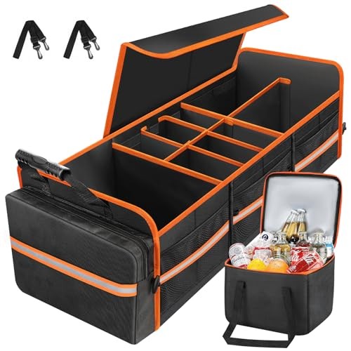 Return Policy Fast Delivery Trusted seller 95L Car Trunk Organizer with Removable Cooler Bag, Collapsible Trunk Storage Organizer with Removable Lid - Multi Compartment Waterproof Storage Organization, Fits Most Car, Truck, Orange Product Description Large Capacity: The car trunk organizer offers a large capacity of 95L, allowing you to store various items such as groceries, gear, daily essentials, food, and more. It is suitable for picnics, travel, shopping outings, and daily use. Comes with detachable leakproof cooler bag keeps meals warm and beverages chilled for hours. It can easily fit into any compartment of the organizer or be used as a standalone cooler Multi-Compartment Storage: This trunk organizer features 3 main compartments, 2 side pockets, and 3 large mesh pockets to keep your car organized. Detachable dividers allow customization of storage spaces for tools, groceries and other essentials. The mesh and side pockets hold small daily items and tools for easy access Sturdy & Long-lasting Materials: The car organizer is made of 1680D waterproof Oxford-fabric and 2.5mm thick PE boards which can support heavy loads without deformation. It resists wear, water damage, and stays sturdy over time. A reflective stripe enhances visibility in low light, making nighttime storage safer and more convenient Portable Foldable Design: This collapsible trunk storage organizer features side buckles that allow you to adjust the storage space to suit your needs. It folds flat for easy storage under seats or in tight spaces when no in use. A removable lid protects privacy, and the reinforced handles make lifting and carrying easy. The fold-flat design maximizes unused trunk space Anti-Slip Base & Straps: The trunk organization equipped with anti-slip base and adjustable securing straps keep the organizer stable during transit, preventing sliding and toppling to ensure your belongings arrive safely. Compatible with most vehicles, RVs, vans, and trucks Shipping Returns Payment Shipping Shipping is FREE to all addresses other than APO/PO boxes in the lower 48 states. All our stock ships from US-based warehouses. Shipped via USPS or UPS (depending on location and package weight) Unless stated otherwise, all orders will ship within 24-72 hours of your payment being processed. Check our feedback to see the great reviews of FAST shipping we offer. Returns Seller does not accept returns Payment We currently accept payment via eBay managed payments only. Once payment is cleared, we will dispatch your shipment within 1-3 business days. Please refer to the "Shipping" tab for more information regarding shipping speed to your destination.