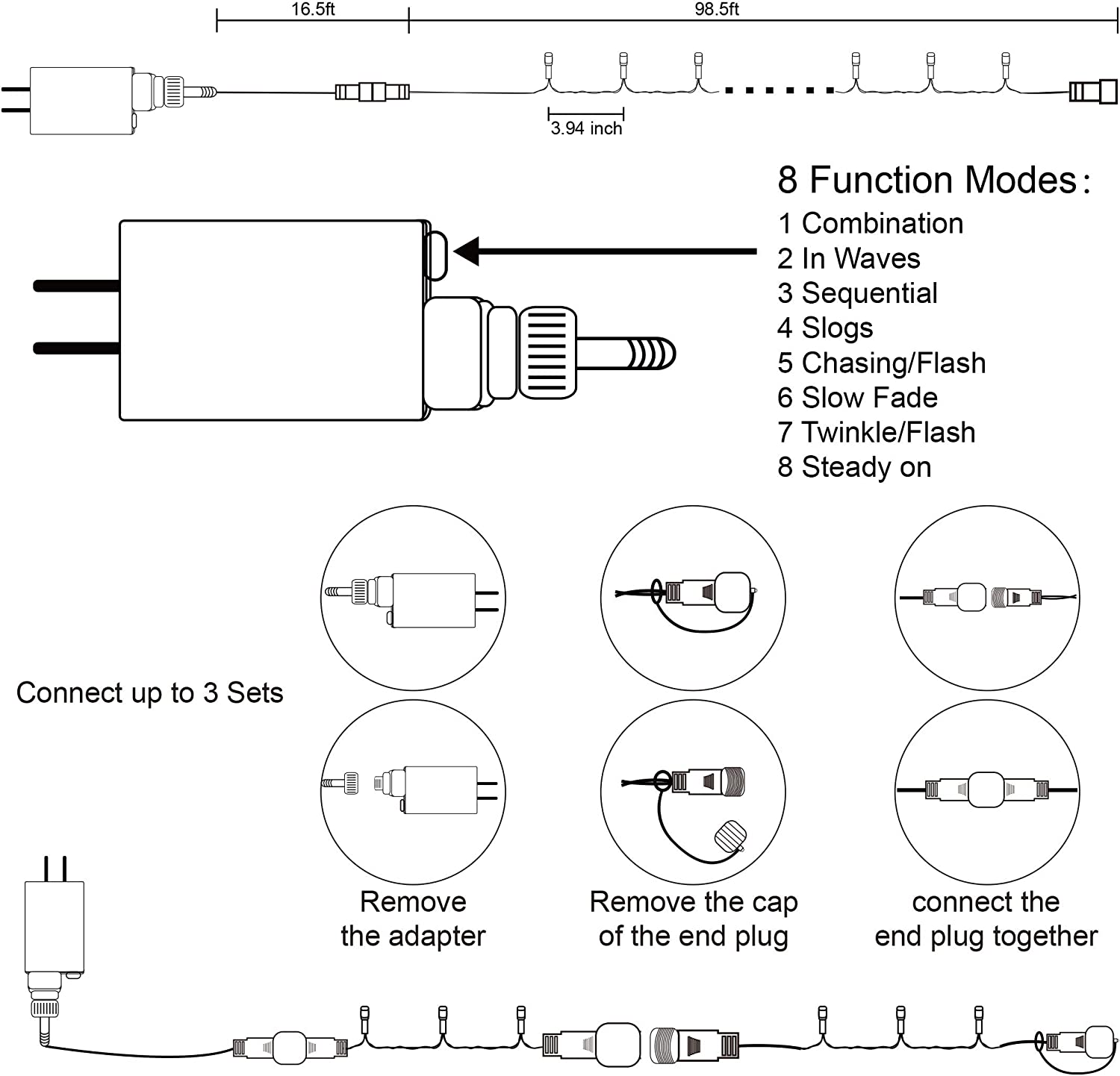 Store New Arrivals Add to Favorite View Feedback Contact 300 LED String Lights Outdoor Indoor, Extra Long 98.5FT Christmas Lights, 8 Lighting Modes, Plug in Waterproof Fairy Lights for Wedding Party Bedroom Decorations (Multicolor) Description Item model number HB-300COI Light Source Type LED Style Modern Number of Items 1 Power Source Corded Electric Number of Light Sources 300 Control Method Remote Theme Wedding Batteries Included? No Assembled Height 2 inches Controller Type button Batteries Required? No Bulb Shape Size B9 Product Dimensions 4 x 3 x 2 inches Assembled Width 3 inches Seasons Christmas Form Factor Flexible, cord-like Included Components LED Lights Item dimensions L x W x H 4 x 3 x 2 inches Indoor/Outdoor Usage Outdoor, Indoor Light Color Multicolor Water Resistance Level Waterproof Item Weight 1.34 pounds Occasion Wedding, Christmas, Halloween Special Features Waterproof Special Feature Waterproof Part Number YYOJ-light-60 Color Multicolor Wattage 300.3 watts Voltage 110 Volts Assembled Length 4 inches 98.5ft Christmas Decorations string lights: With 300 multicolor individual LED bulbs. Each fairy string lights has end-to-end connection; you can connect up to 3 sets together to illuminate a wider range. 8 Lighting Functions: Our Halloween string lights have 8 lighting modes: combination, in waves, sequential, slogs, chasing/flash, slow fade, twinkle/flash, and steady on. Fit different occasions, moods, feelings, holidays, festivals, anniversaries, etc. Pressing the round button on the transformer to change the lighting modes. 29V Low Voltage String Lights: Keep at a low temperature state after lighting up for hours, ensure and maximize the safety. Directly plug in and unplug it for power on and off. US standard outlet, voltage 110V. Adapter to the first LED light: 16.5ft. Total length (lights string and leading line): 115ft. Waterproof & Widely Use: The strong construction makes the string lights tough and sturdy, and waterproof designed string lights perfect for indoor outdoor decorations, ideal for Christmas, wedding, party, home, bedroom, wall, garden or balcony decorations. Tips: Please note that the LED and transformer are IP 44 waterproof, so it can meet normal use outside but not enough to put under water directly. Product Description Feature: 300 LED 98.5ft Multicolor Xmas String Lights 98.5ft Xmas Decorations string lights with 300 colorful individual LED bulbs. Perfect for indoor and outdoor decorations. 8 lighting modes: combination, in waves, sequential, slogs, chasing/flash, slow fade, twinkle/flash, and steady on. Perfect for Christmas, Halloween, party, Valentine's Day, wedding, home, window, bathroom, festival, Holiday, shows, restaurant, hotel, commercial building, shopping center etc. Specification: Material: Plastic Light Color: Multicolor LED Count: 300 pcs Total Length (end to end): 115FT String lights: 98.5FT Waterproof Level: IP44 Voltage: 110V Output: 29V safe low voltage Power Supply: Adapter Powered Package Including: 1 x 300 LED White String Lights Some More Christmas Decorations Add to Cart Add to Cart Add to Cart Add to Cart Customer Reviews 3.8 out of 5 stars 75 3.6 out of 5 stars 85 4.1 out of 5 stars 725 4.5 out of 5 stars 220 4.5 out of 5 stars 139 4.6 out of 5 stars 15,545 4.6 out of 5 stars 5,214 Price — — — $39.99 $ 39 . 99 $25.49 $ 25 . 49 $17.99 $ 17 . 99 $19.79 $ 19 . 79 Package: 2 Pack 3 Pack 1 Pack Set of 4 Set of 3 1 Pack 1 Pack Number of Light Sources: 2 x 10 LED 3 x 10 LED 10 Count 70 LED 60 LED 300 LED 300 LED Powered Source: Battery Powered Battery Powered Plug In Adapter Powered Adapter Powered Adapter Powered Adapter Powered Material: Plastic Plastic Plastic PVC Plastic, Metal PVC Plastic, Organza Plastic Plastic Light Color: Warm White Warm White Clear Warm White Warm White Red & Green Red Some More Christmas Decorations Add to Cart Customer Reviews 4.2 out of 5 stars 134 4.2 out of 5 stars 134 4.2 out of 5 stars 134 4.2 out of 5 stars 106 4.4 out of 5 stars 406 4.4 out of 5 stars 406 4.4 out of 5 stars 406 Price — — — $25.99 $ 25 . 99 — — — Package: 1 Pack 1 Pack 1 Pack Set of 6 2 Pack 2 Pack 2 Pack Number of Light Sources: 50 LED 50 LED 50 LED 100 Count 50 LED Each 50 LED Each 50 LED Each Powered Source: Adapter Powered Adapter Powered Adapter Powered Plug In Battery Powered Battery Powered Battery Powered Material: Plastic Plastic Plastic Plastic Plastic Plastic Plastic Light Color: Warm White Multicolor Red Purple Clear Warm White Multicolor Cool White Warm White Some More Christmas Decorations Add to Cart Add to Cart Add to Cart Add to Cart Add to Cart Add to Cart Customer Reviews 4.6 out of 5 stars 15,545 4.6 out of 5 stars 15,545 4.4 out of 5 stars 2,522 4.4 out of 5 stars 2,522 4.4 out of 5 stars 2,522 4.4 out of 5 stars 2,522 4.4 out of 5 stars 2,522 Price $23.99 $ 23 . 99 $17.99 $ 17 . 99 $12.99 $ 12 . 99 $12.99 $ 12 . 99 $12.99 $ 12 . 99 $12.99 $ 12 . 99 — Package: 1 Pack 1 Pack 1 Pack & 3 Pack 1 Pack & 3 Pack 1 Pack & 3 Pack 1 Pack & 3 Pack 1 Pack & 3 Pack Number of Light Sources: 200 LED 200 LED 150 Each 150 Each 150 Each 150 Each 150 Each Powered Source: Adapter Powered Adapter Powered Plug In Plug In Plug In Plug In Plug In Material: Plastic Plastic Plastic Plastic Plastic Plastic Plastic Light Color: 20 Colors Red & Green Red Blue Green Clear Warm White Multicolor Some More Christmas Decorations Add to Cart Add to Cart Add to Cart Add to Cart Add to Cart Add to Cart Add to Cart Customer Reviews 4.6 out of 5 stars 15,545 4.6 out of 5 stars 15,545 4.6 out of 5 stars 15,545 4.6 out of 5 stars 15,545 4.6 out of 5 stars 15,545 4.4 out of 5 stars 262 4.4 out of 5 stars 262 Price $18.99 $ 18 . 99 $16.99 $ 16 . 99 $16.99 $ 16 . 99 $16.99 $ 16 . 99 $16.99 $ 16 . 99 $29.69 $ 29 . 69 $31.34 $ 31 . 34 Package: 1 Pack 1 Pack 1 Pack 1 Pack 1 Pack 1 Pack 1 Pack Number of Light Sources: 200 LED 200 LED 200 LED 200 LED 200 LED 1000 LED 1000 LED Powered Source: Adapter Powered Adapter Powered Adapter Pow