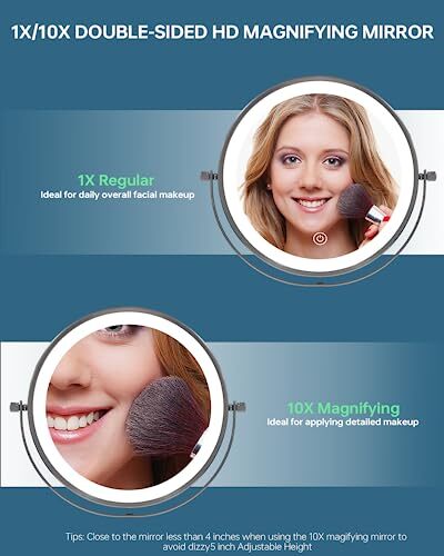 This makeup mirror is a game-changer! The 10x magnification is perfect for precise brows or flawless foundation. The dimmable LED lights give salon-quality lighting (3 color options!), and the adjustable height is so convenient. The 5000mAh battery lasts forever, and the sleek gunmetal gray looks luxurious. Totally worth it for makeup lovers!