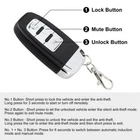 Engine push start button and lock system. With this, you can start or stop your car much easier and keep your car safe at the same time. Features: Intelligent one key to start the system, using smart chips, can provide a key to start / flameout, convenient and simple. Keyless entry, automatic sensor switch lock function, near the car 2 meters, the automatic sensor unlock. There is a remote start / flameout, countdown ten minutes off function. Summer cool car, winter warm car, no longer bear the car when the uncomfortable. With the identity function, the remote control is not able to start normally. Specifications: Main material: ABS Color: black Remote Control Battery: 1 * CR2032 button battery, 3V 240mAh ( included) Working voltage: DC 12V Quiescent current:less than 10mA Working frequency: 433MHz Item weight: 400g / 0.88lb Package size: 300 * 100 * 50mm / 11.8 * 3.9 * 2.0in Package weight: 550g / 1.21lb Package List: 1 * Host 2 * Remote Control Handle 1 * Start Button 2 * Sensing Antenna 1 * Start Harness 1 * Detection Harness 1 * Restore Button 1 * Manual