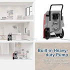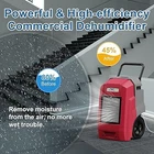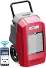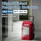 This red commercial dehumidifier removes up to 180 pints (under 95 degrees & 90% RH conditions) of moisture per day and covers up to 2300 sq. ft. It has an automatic shut off when the room humidity reaches the preset setting and automatically goes back on once the humidity reaches the desired preset setting. A mobile app can be downloaded to the mobile phone, facilitating monitoring a restoration process while on the go. In addition, a heavy-duty 14.7 ft. drain pump connecting with a 9.6 ft. long drain hose (included) makes it easy to drain the condensation automatically. It also features an automatic restart after power outages, auto defrost, and continuous drainage (built-in pump). This is a portable dehumidifier designed with the sleek and modern look. With four universal casters and ergonomically placed handles, you can move this dehumidifier easily in your area, even from downstairs to upstairs. DIMENSIONS 21.2"D x 22"W x 38"H.