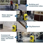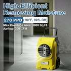 This yellow commercial dehumidifier removes up to 270 pints (under 95 degrees & 90% RH conditions) of moisture per day and covers up to 3000 sq. ft. It has an automatic shut off when the room humidity reaches the preset setting and automatically goes back on once the humidity reaches the desired preset setting. A mobile app can be downloaded to the mobile phone, facilitating monitoring a restoration process while on the go. In addition, a heavy-duty 14.7 ft. drain pump connecting with a 9.6 ft. long drain hose (included) makes it easy to drain the condensation automatically. It also features an automatic restart after power outages, auto defrost, and continuous drainage (built-in pump). This is a portable dehumidifier designed with the sleek and modern look. With four universal casters and ergonomically placed handles, you can move this dehumidifier easily in your area, even from downstairs to upstairs. DIMENSIONS: 22.3"D x 23.6"W x 39.7"H.