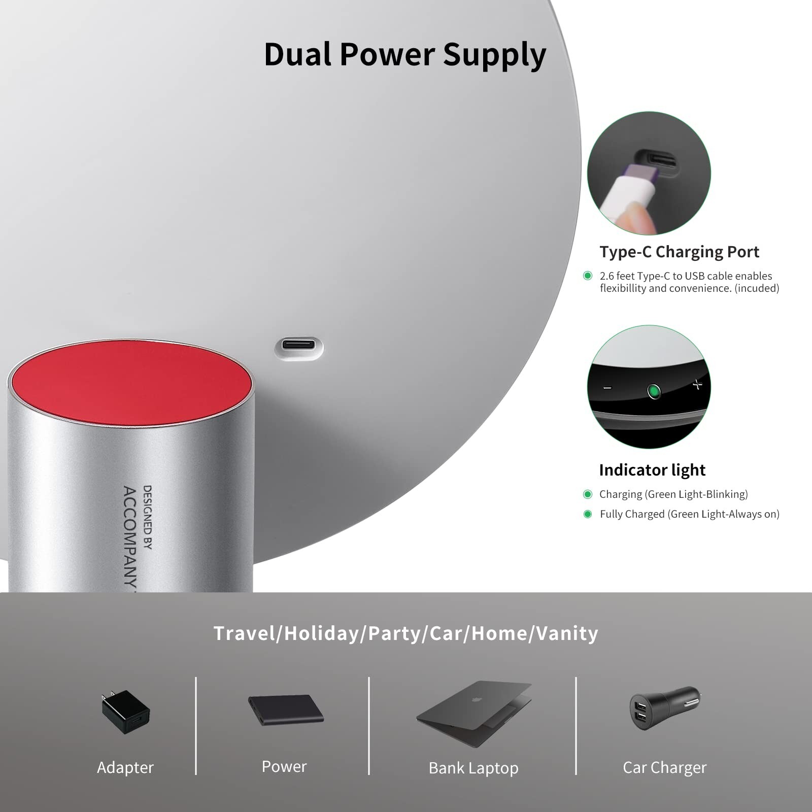 AMIRO 9" Lighted Makeup Mirror with Smart Sensor & Touch-Control, 3 Colors & 6 Brightness, Rechargeable & Cordless, Memory Function, Free Rotation, Gift for Woman - White Product Details Size: 9'' -White Brand: AMIRO MPN: AML009 UPC: Does not apply EAN: Does not apply Brand: AMIRO Room Type: Dressing Room, Bedroom, Home Office Shape: Round Product Dimensions: 10.7"L x 17"W Frame Material: Metal Brand: AMIRO Room Type: Dressing Room, Bedroom, Home Office Shape: Round Product Dimensions: 10.7"L x 17"W Frame Material: Metal Style: 现代 Mounting Type: Tabletop Mount Special Feature: USB Rechargeable, 3 Color Modes & 6 Brightness Levels, Touch Sensor & Memory Function Color: White Theme: Modern Specific Uses For Product: Makeup, Personal Grooming Number of Pieces: 1 Number of Items: 6 Material: Aluminum Frame Type: Framed Item Weight: 2.93 Pounds Assembly Required: No Frame Color: White Manufacturer: AMIRO Item Weight: 2.93 pounds Country of Origin: China Item model number: AML009 Batteries: 1 Lithium Ion batteries required. (included) Date First Available: June 24, 2022 Makeup Mirror, With Small 10X Magnifying mirror9'' size vanity mirror, entire face in HD view. With a small 10X Magnifying mirror for applying detailed makeup, wearing contact lenses and eyebrow tweezing, shaving, hair styling, and facial care. Makeup mirror built-in Premium bright led lights can light the darkest and poorly lit areas, natural and soft, bright but not dazzling. Easily switch the color to see how exactly your makeup will look in various lighting situations. Smart Touch Control & Memory FunctionThis makeup mirror with lights has 3 smart touch buttons, turn on/off the light by touching the sensor switch, pressing the left button to change the color modes, and long press the right button to adjust the led brightness. The makeup mirror with lights can automatically turn on or turn off when it detects human movement. This lighted makeup mirror is specially designed for memory function and keeps your lights set like your last use. USB rechargeable and built-in 2000 mAh Battery AMIRO makeup mirror has a built-in 2200 mAh rechargeable lithium battery, which continuously works for up to 3-5h after fully charged. It can be charged through a USB by a power bank, PC, etc., and work lighted for a long time. Convenient to move the vanity mirror with lights to another desk. Note: The USB-C cable is in the box. Brightness Adjustable and 3 Color Lighting ModesAMIRO vanity mirror with 50,000 hours life, CRI97, 1.66 million light surround, Max 5200 Lumens high brightness LED Light Strip, with warm /natural /cold white three-tone settings, and the brightness can be adjusted to 0%-100%. The led lights are controlled by the smart touch sensor switch on the mirror face, a short press to turn on/off the light, which can perfectly meet your different makeup needs and make your makeup more delicate. 50Rotation and Durable Made50 degree free rotation can let you place this lighted makeup mirror swiveled to each side easily and help you to see more detail, convenient for you to select the best angle or position. There are soft and non-slip rubbers at the mirror base, stable enough to place this lighted makeup mirror on the table by itself. Not only a professional makeup vanity with lights but this lighted makeup mirror can also be used as a desk lamp, night light, ambient light and etc. Perfect Gift & 100% Satisfaction GuaranteeThis vanity mirror with lights is very suitable as a gift for girls who love beauty. Especially on birthdays, Valentine's Day, Mother's Day, Christmas, etc. We offer a 12-MONTH Exchange or 30-DAY Money Back Warranty Unconditionally, please feels free to contact us if you have any problems with the makeup mirror.