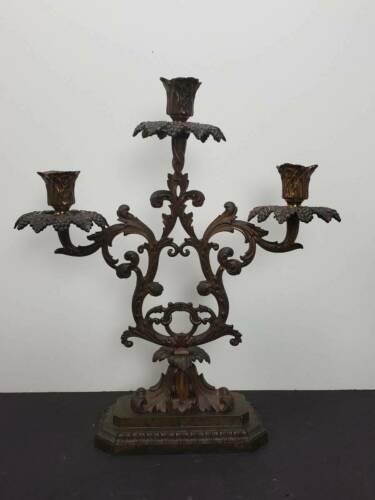 ANTIQUE BRONZE THREE ARM CANDLELABRA BLAKES PATENT, 19TH CENTURY Available for your consideration is this lovely three arm candelabra by Blake. Circa 19th century. This beautiful candelabra is either cast brass or bronze. It is decorated with leaf shaped holders and grape leaf and fruit bobeches. Each bobeche has x prisms. Marked "BLAKES PATENT" on the lower back side. The candelabra measures approx. 16 1/2" tall and 14 3/4" wide. Base measures approx. 8" wide and 4" deep. In very good antique condition. Bronze has been orange oiled. No chips, cracks, breaks or repairs found. Shed find, prisms may need a better cleaning. The pictures are an important part of this listing. Please use them as a condition aid. If you require additional photos or have questions please email before bidding. Thank you for looking. ATTENTION INTERNATIONAL BUYERS: Please understand that all international shipments will be shipped with full value declared. We will not falsify customs documents for any reason. It is illegal. I sell Vintage and Antique items therefore it is not always possible to include all scratches, imperfections etc. *COLORS ARE OUR BEST JUDGEMENT, SO PLEASE SEE PICTURES Please be aware my photos are considered part of the listing description and the description is based on my own knowledge, experience, and research. Statements regarding maker, age, origin, etc. particularly on unmarked pieces, should be evaluated and confirmed by you the buyer, as you are the final judge. Please ask questions that will help you in these evaluations. I also encourage and gladly accept opinions from knowledgeable buyers which only helps to make me a better seller and serve you better. Descriptions are as inclusive as possible but i f I miss something that is important to you please email me prior to bidding. I am always willing to combine shipping when practical. CT residents must add 6.35% sales tax. See my other listings for more great items! We accept PayPal and certified checks only. Shipping is generally the day following the receipt of payment via USPS or FedEx. If you have a preferred shipper please let me know. txzj pxzj24187 txzj-11 txzj85 txzj115