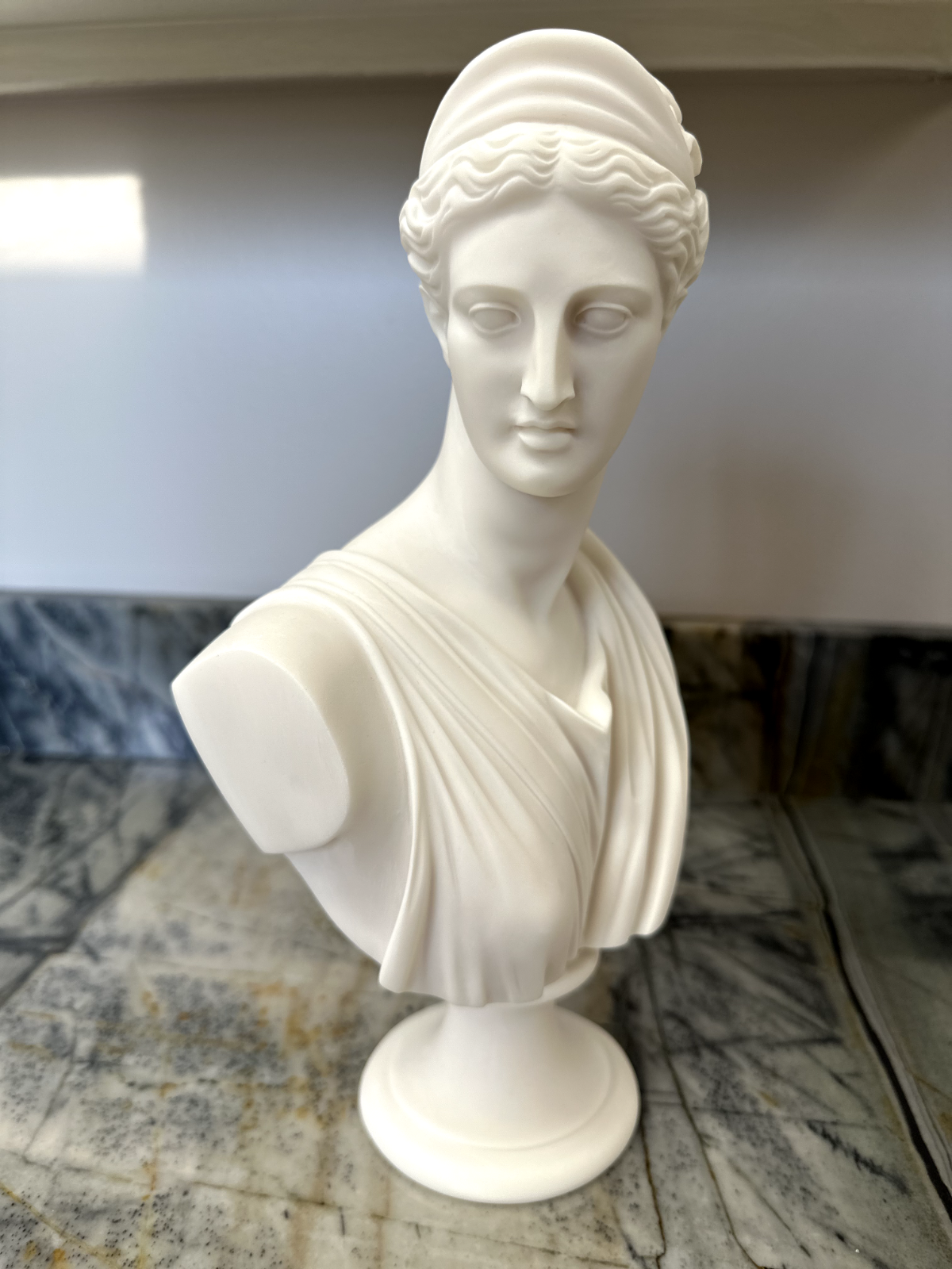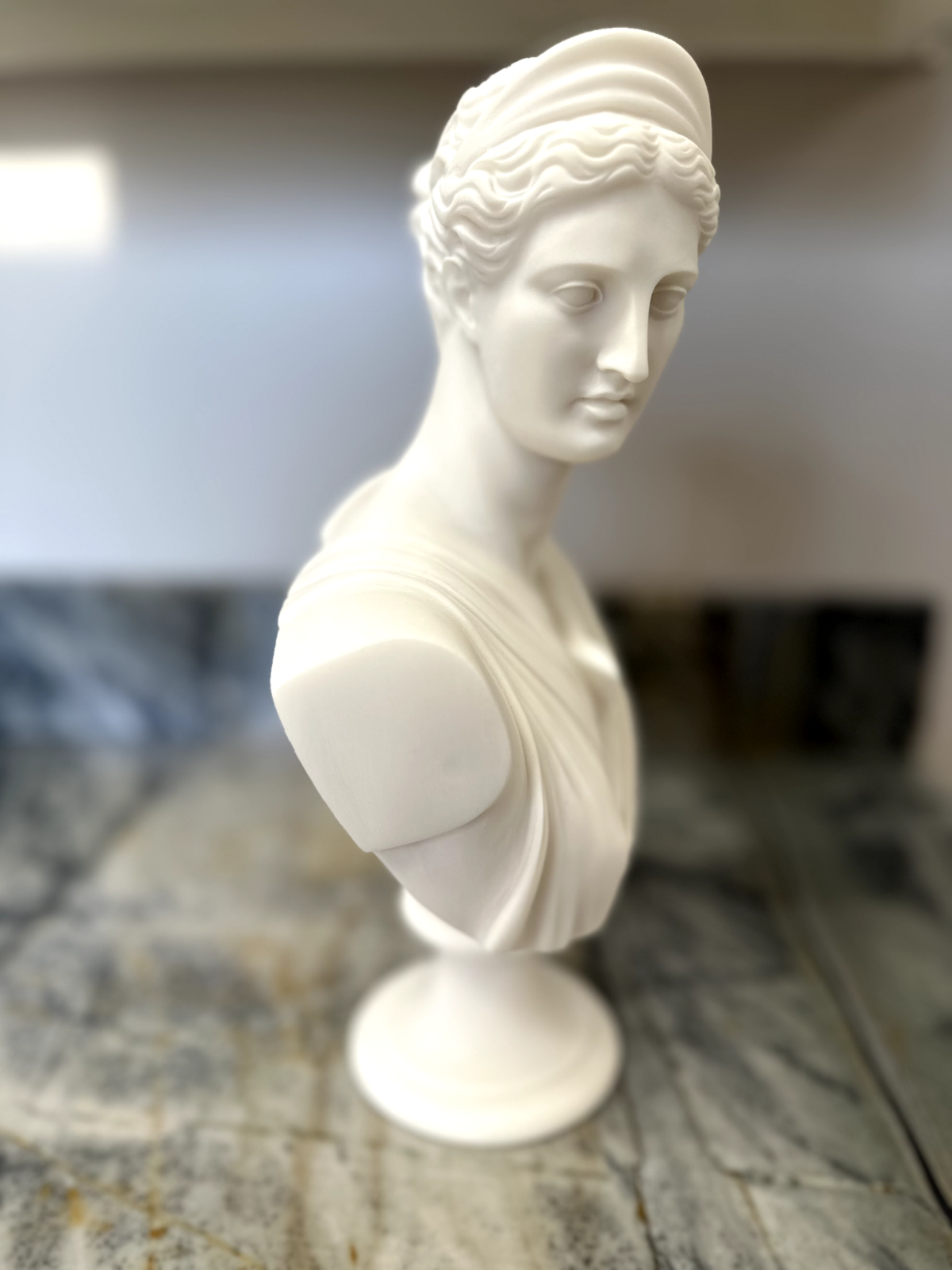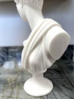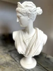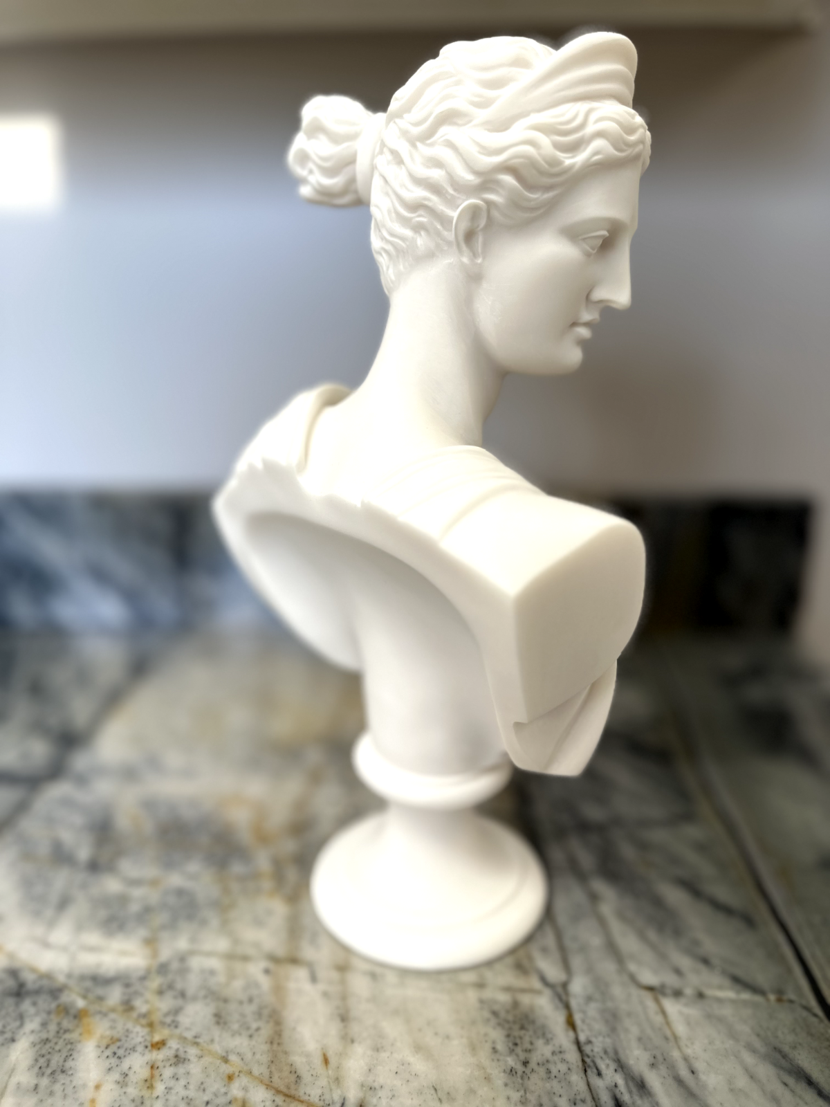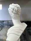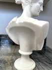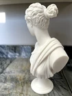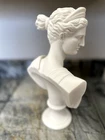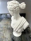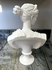 Elevate your space with the Artemis Diana Bust Head Greek Roman Goddess Statue, an exquisite representation of mythological artistry. In Greek mythology, Artemis was the daughter of Zeus and Leto and the twin sister of Apollo. In Roman mythology, she was known as Diana. She was the virgin moon goddess of the hunt, wild animals, healing, wilderness, chastity, and, ironically, childbirth (she was worshipped as a fertility/childbirth goddess mostly in cities). Carved with meticulous attention to detail, this 12.2-inch medium-sized bust brings the enigmatic allure of Greek culture directly to your table. The natural alabaster material provides a cool, understated texture and a touch of timeless elegance. This piece is an ideal addition for collectors and enthusiasts alike who value the intersection of cultures and ethnicities in their dΓ©cor. Dimensions: Height - 12.2" / Width - 7.48" / Depth - 2.5" Finish: Cast Alabaster Cast Alabaster is a natural crushed stone that gives the feeling of marble; it's a solid, heavy-weight material that is water-resistant. It was first cast from a mold and finished by hand to ensure the finest quality. Made in Crete, Greece ******** I am a brand new seller on eBay, however you may contact me for FBMP reviews.