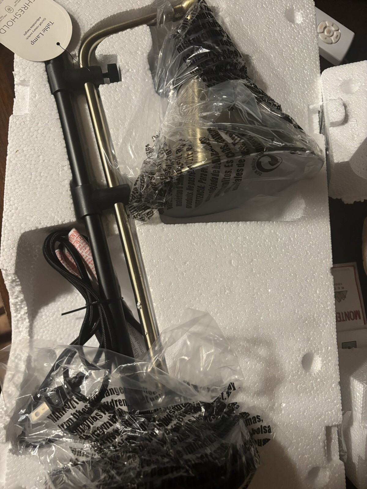 Add a sleek touch to your desktop with the Adjustable Table Lamp from Threshold™. At 21.5 inches in height, this freestanding table lamp has a sleek tubular body atop a round base in black finish. It has an adjustable, angular arm in a bronze tone, topped with a cone metal shade in black hanging downward. This decorative table lamp allows you to find the perfect lighting height with the adjustable arm, making it excellent for focusing light wherever you need it.